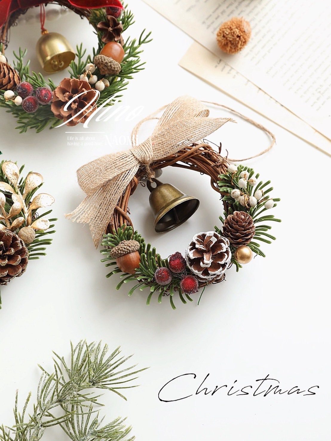 質感小巧的聖誕花環,搭配蝴蝶結與金鈴鐺,點綴松果、堅果與紅果實,展現滿滿的節日氛圍🎄🔔