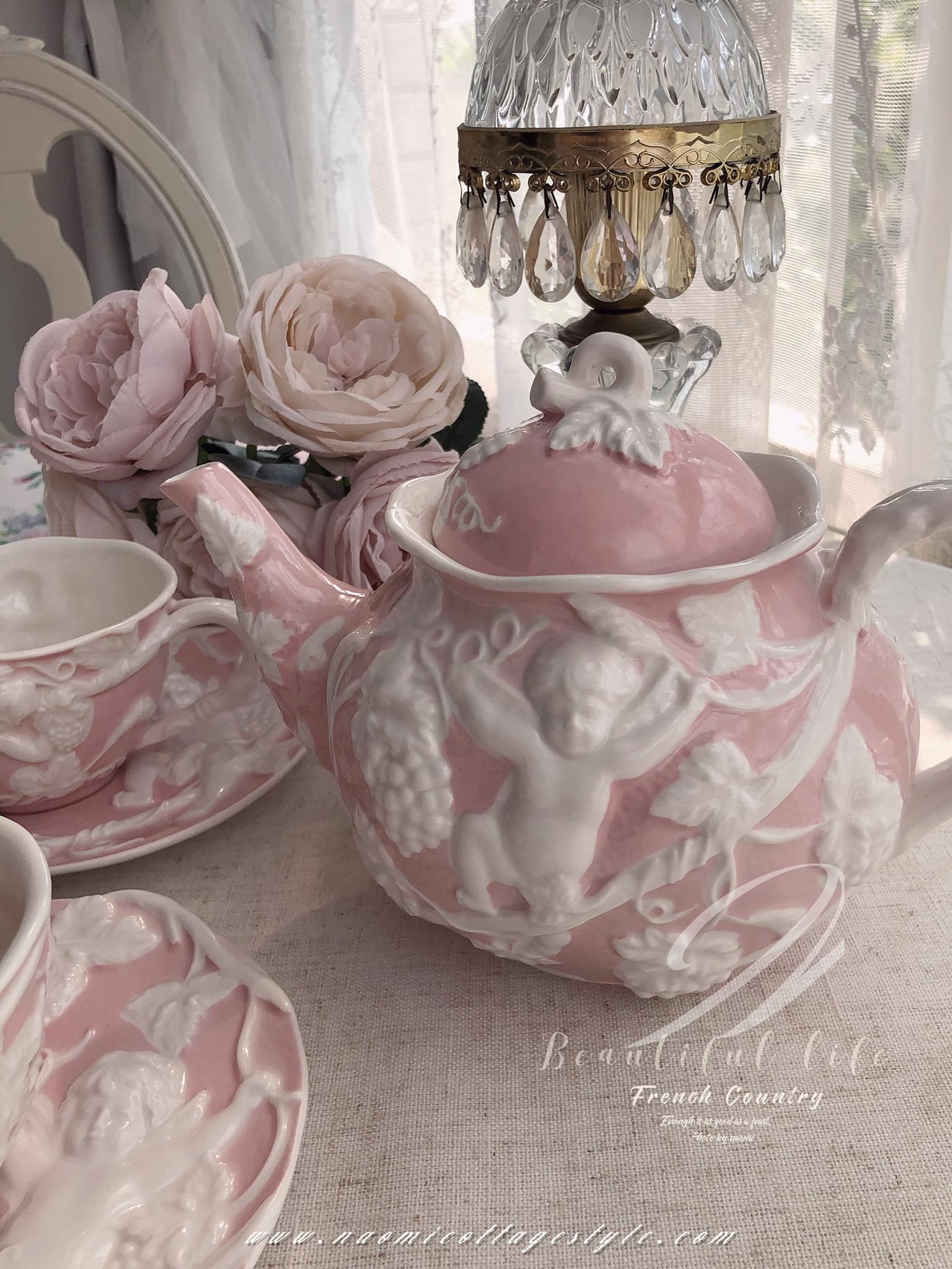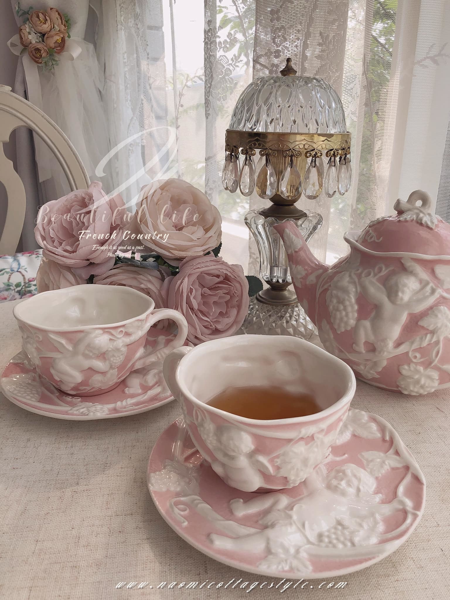 🌹復古天使浮雕圓肚茶壺+2杯盤組