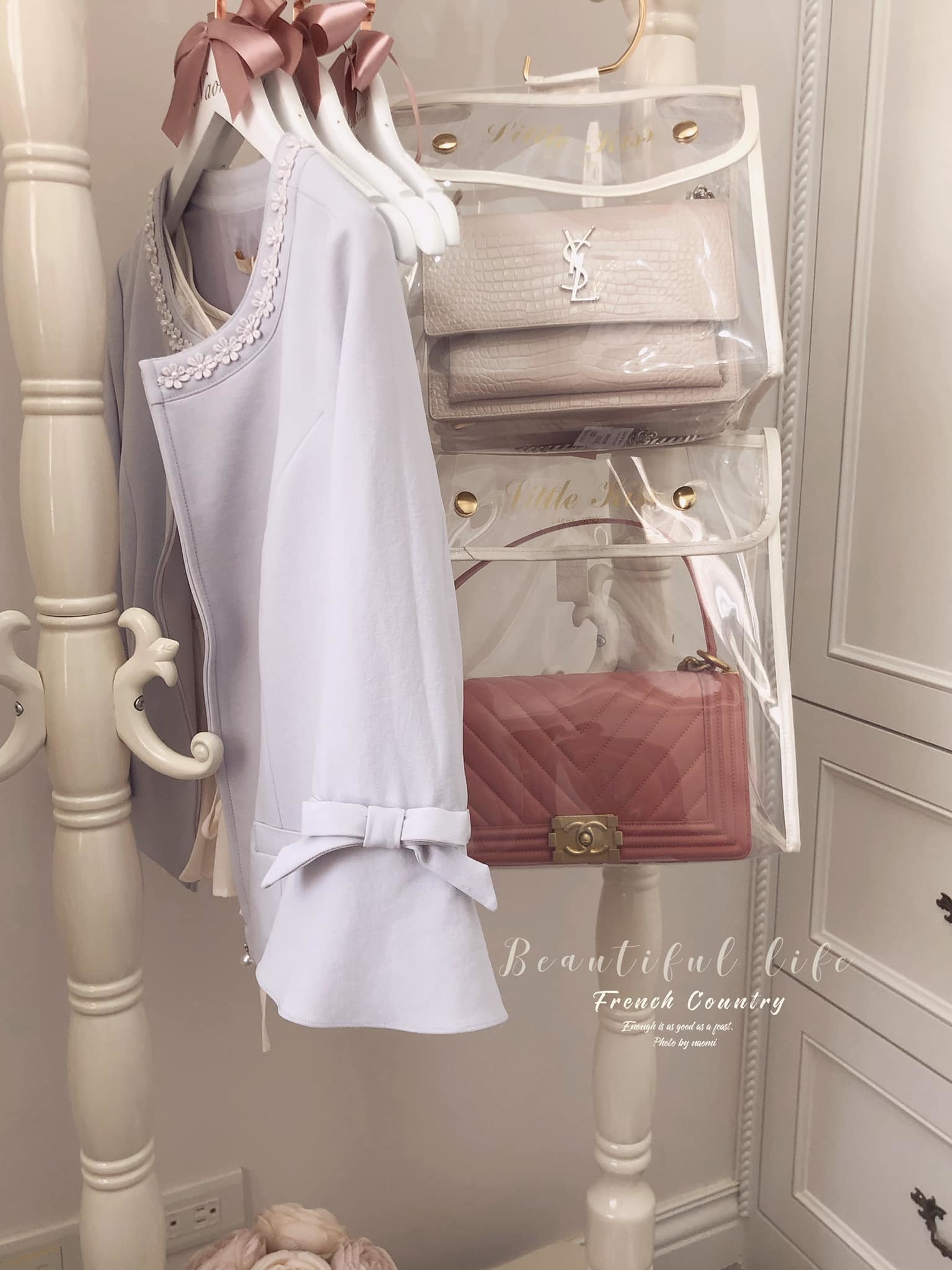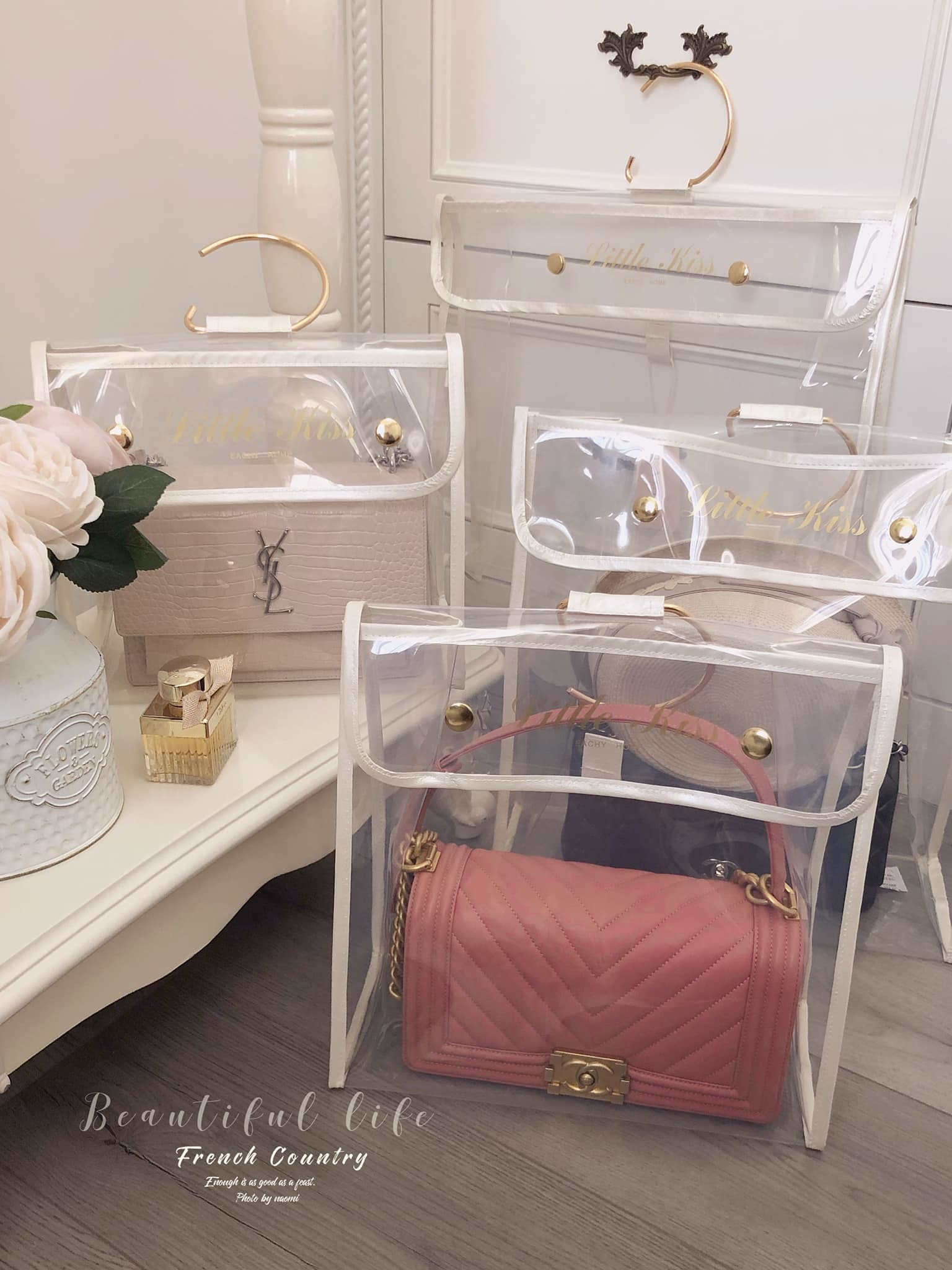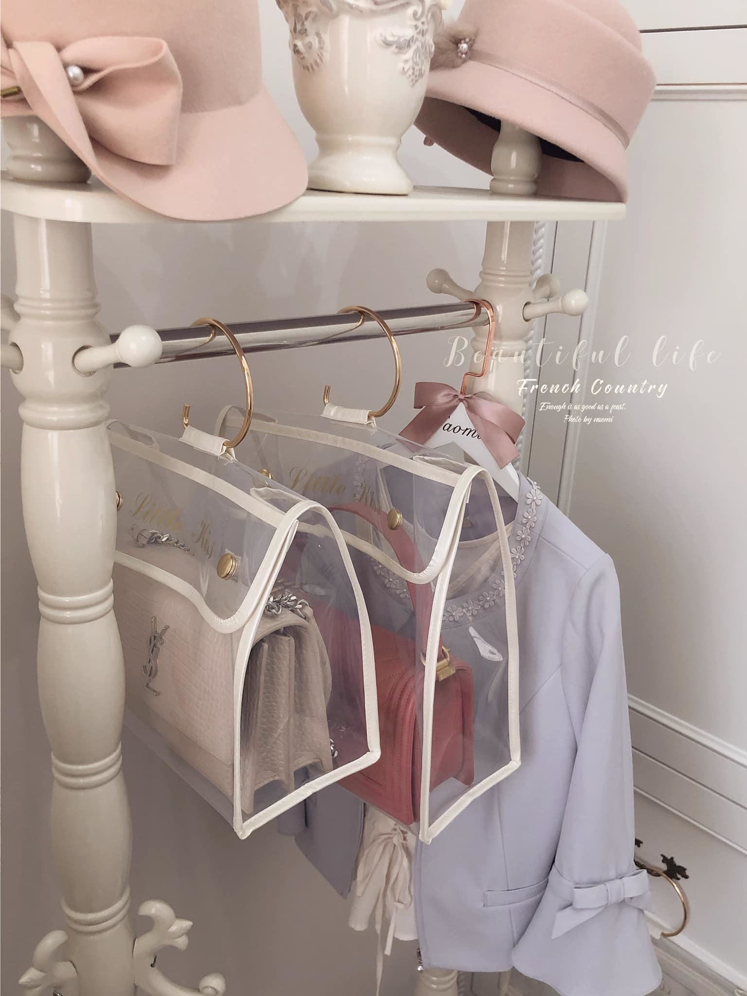 這應該是最好看的防塵袋了吧,白色系的皮革包邊有著珍珠白的光澤。提袋設計也讓收納袋有更多的收納方式,收納後可以直接放儲物櫃或吊掛著。透明EVA材質厚實耐用,找包也一目瞭然。