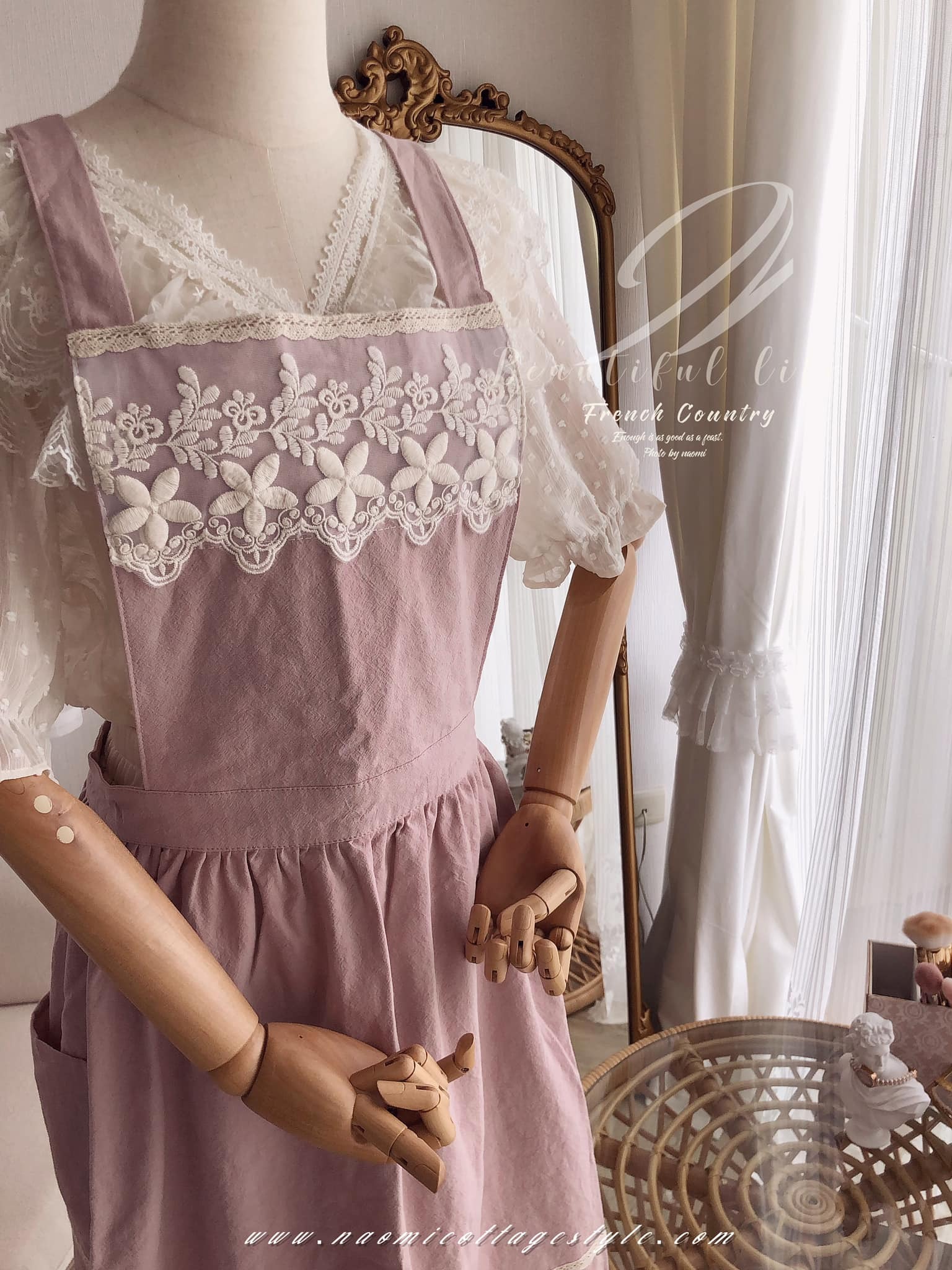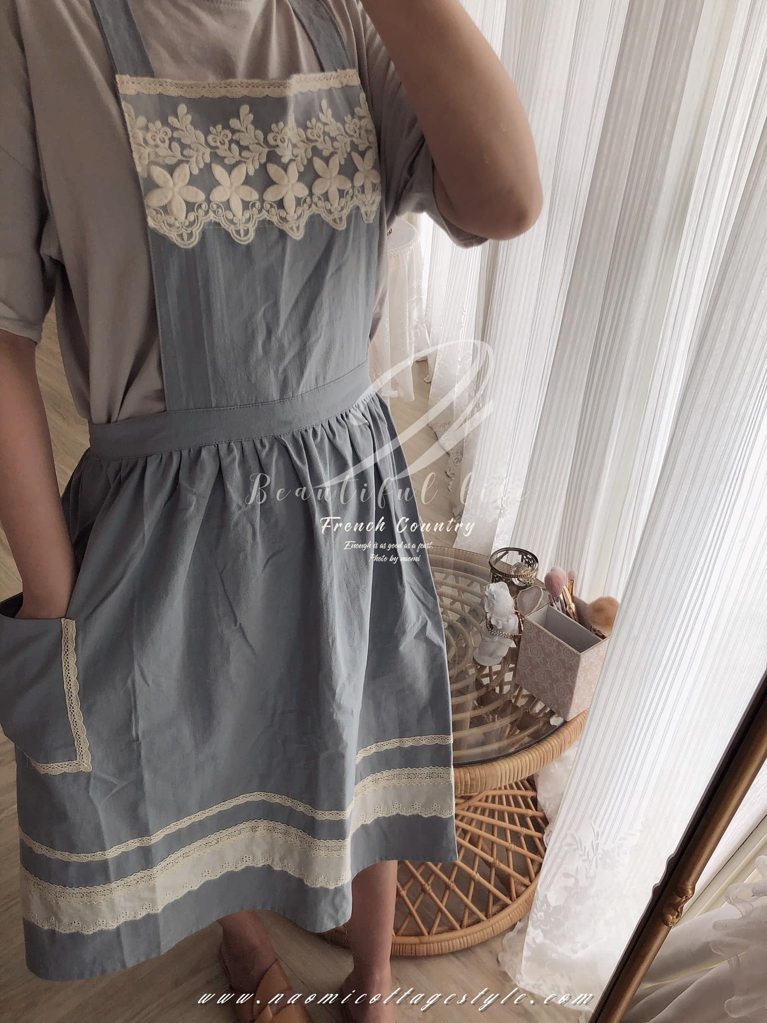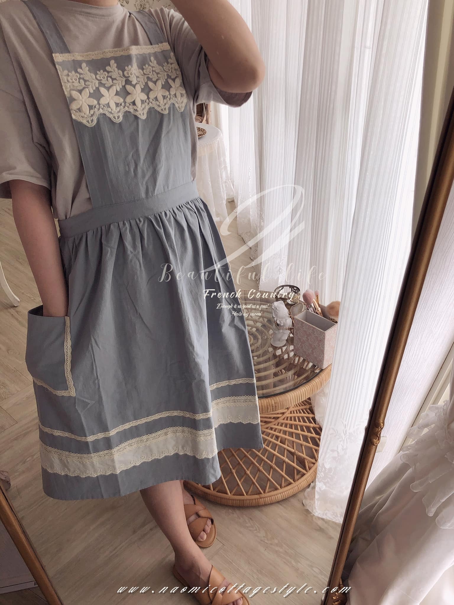 法式加長棉質蕾絲圍裙、口袋工作裙