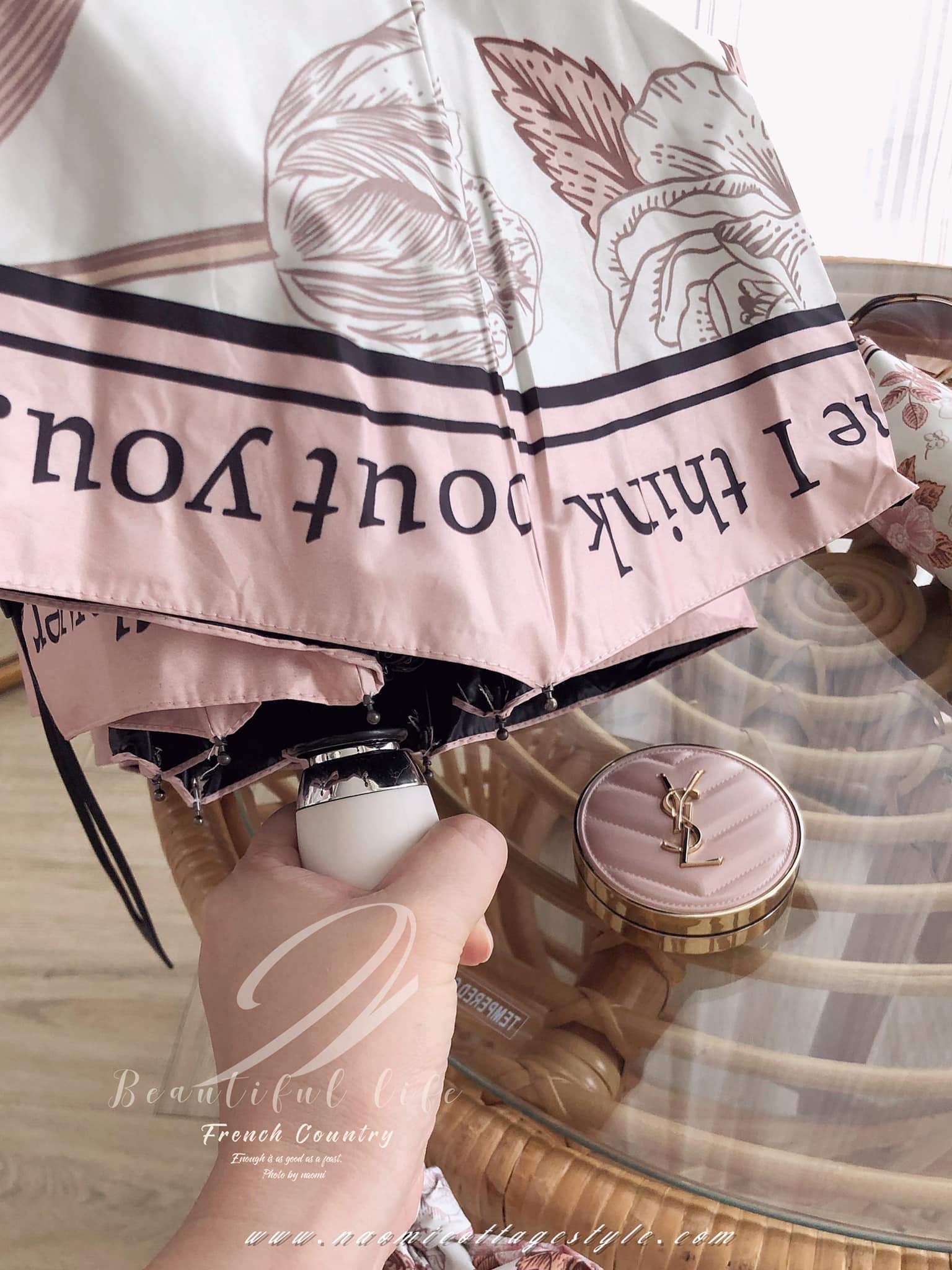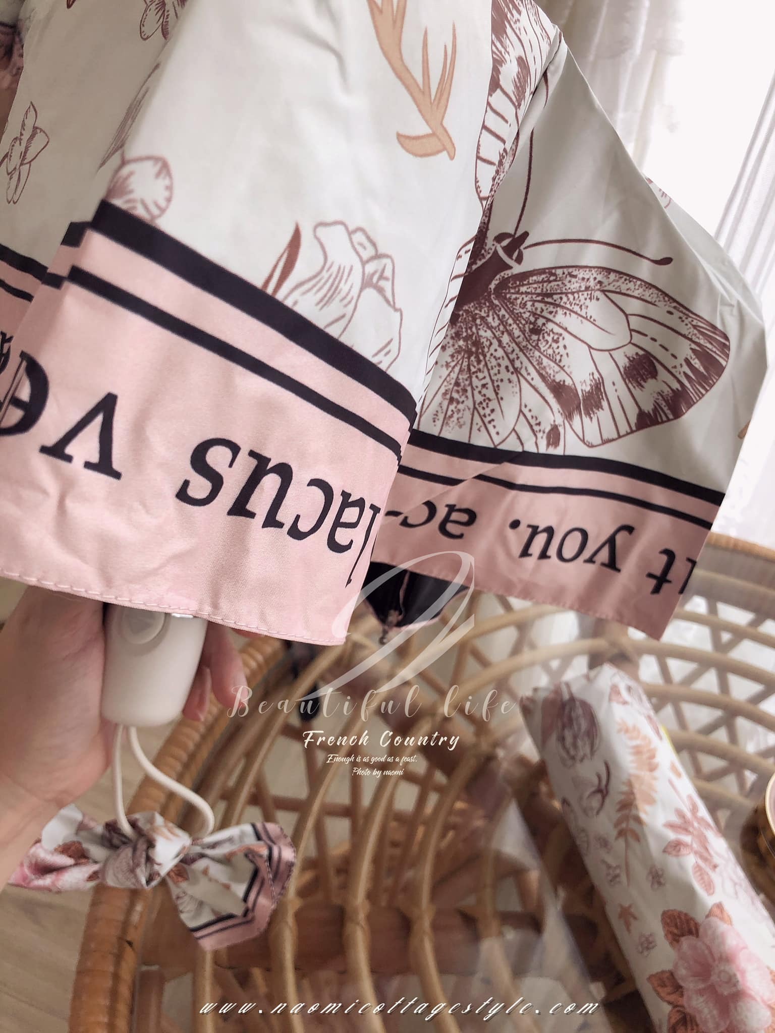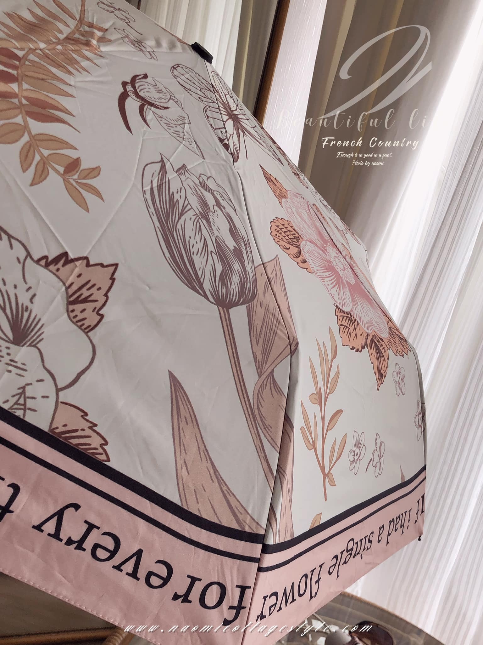 傘款設計上很有質感,手把磨砂設計,傘面邊緣英文風格設計濃濃浪漫風情✨底色是米白色的,很高級復古、優雅、浪漫。這款 #防曬抗UV的漂亮晴雨傘  真的很美~~傘把的地方是傘袋打結上去變成蝴蝶結裝飾,精緻可見。傘內黑膠塗層,高溫的戶外活動,撐傘降溫很多。