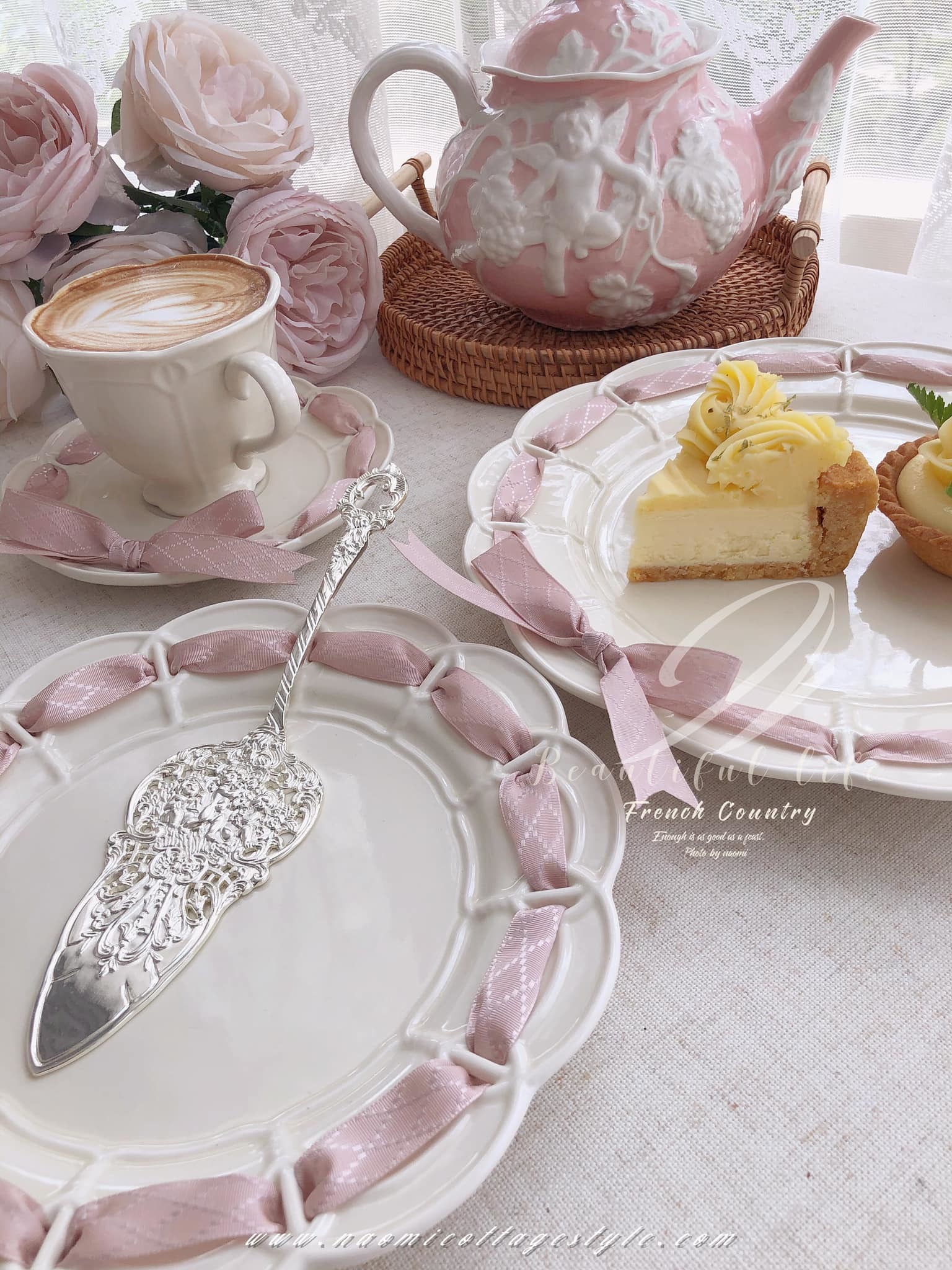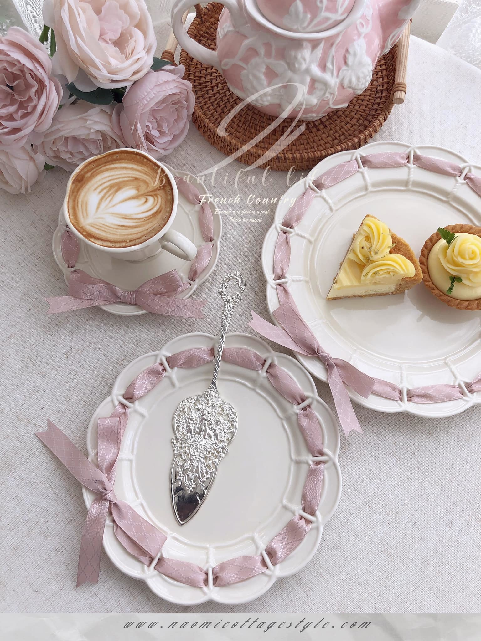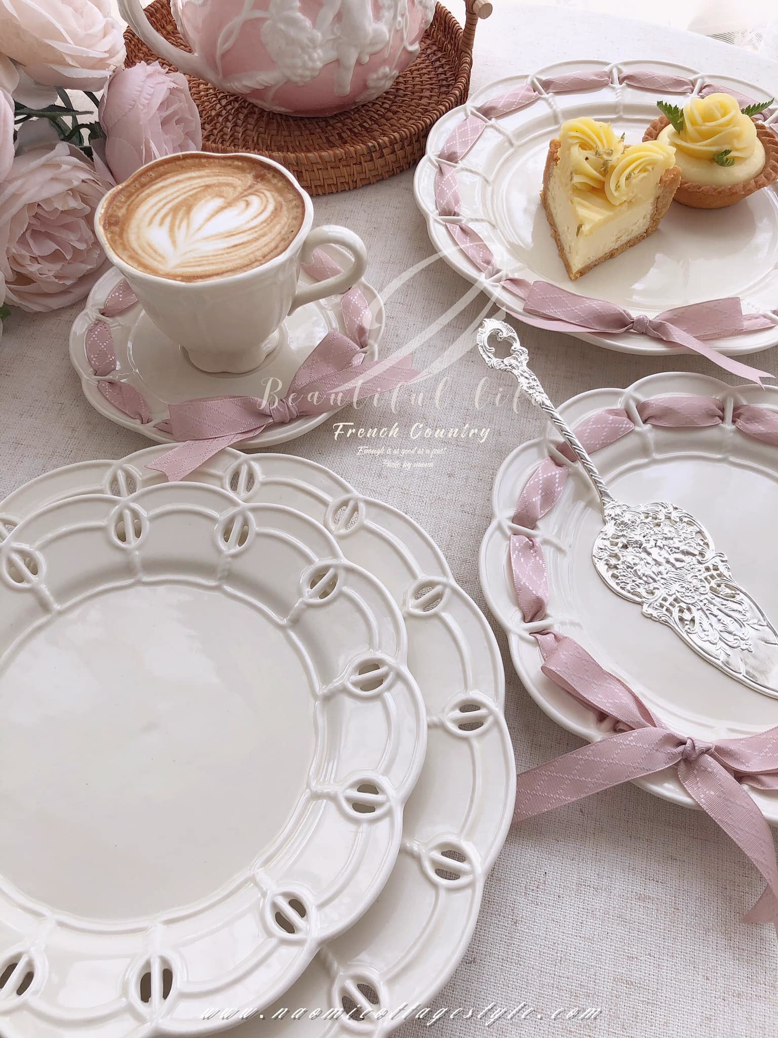 瓷質奶油白顯得輕柔,簍空花邊繫上緞帶的完美結合,享受優雅的午茶甜點時光🍮