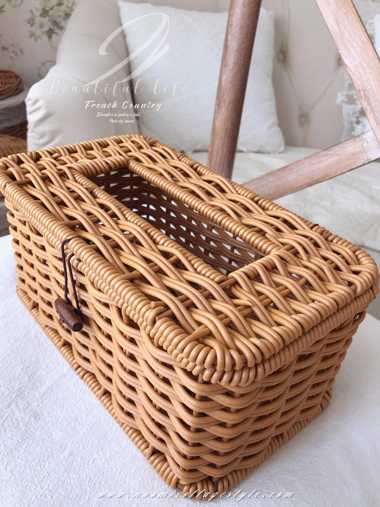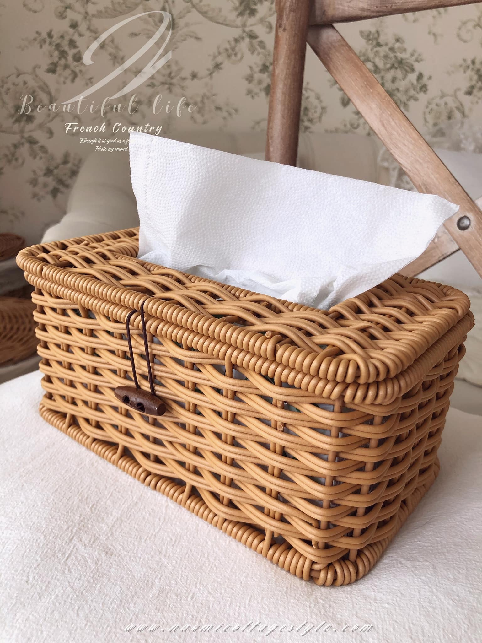純手工編織而成,將自然藝術與生活用品融合在一起,完美修飾塑膠袋裝面紙讓生活用品融入居家佈置。手工仿藤編織結實耐用+內置金屬框架堅固,精緻開蓋拉帶卡扣設計。