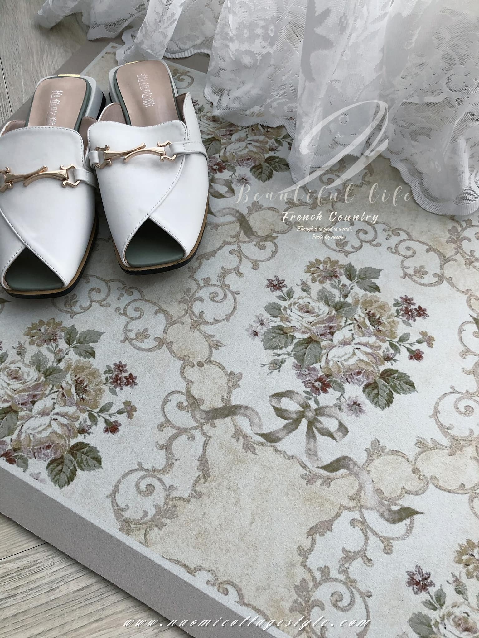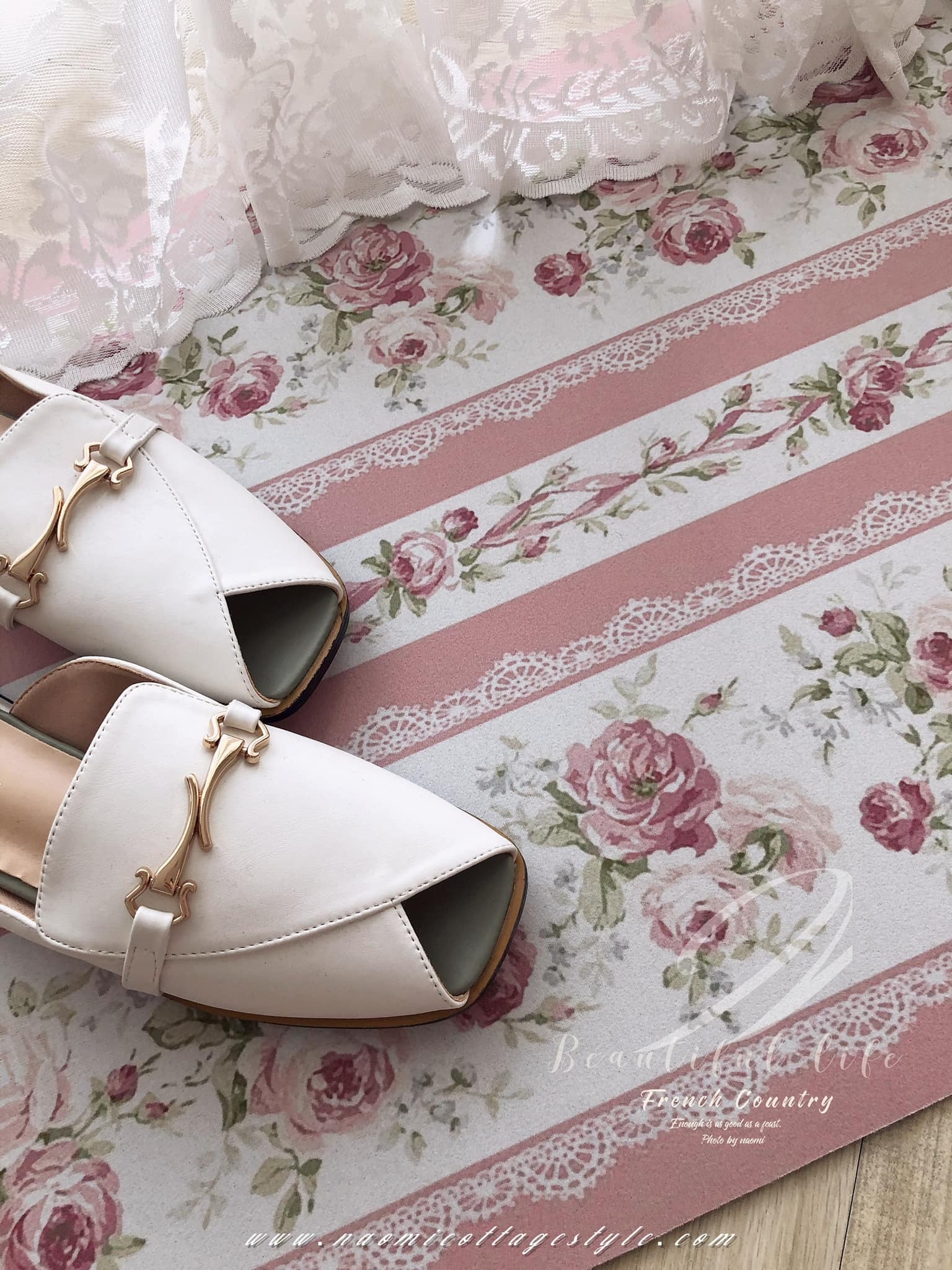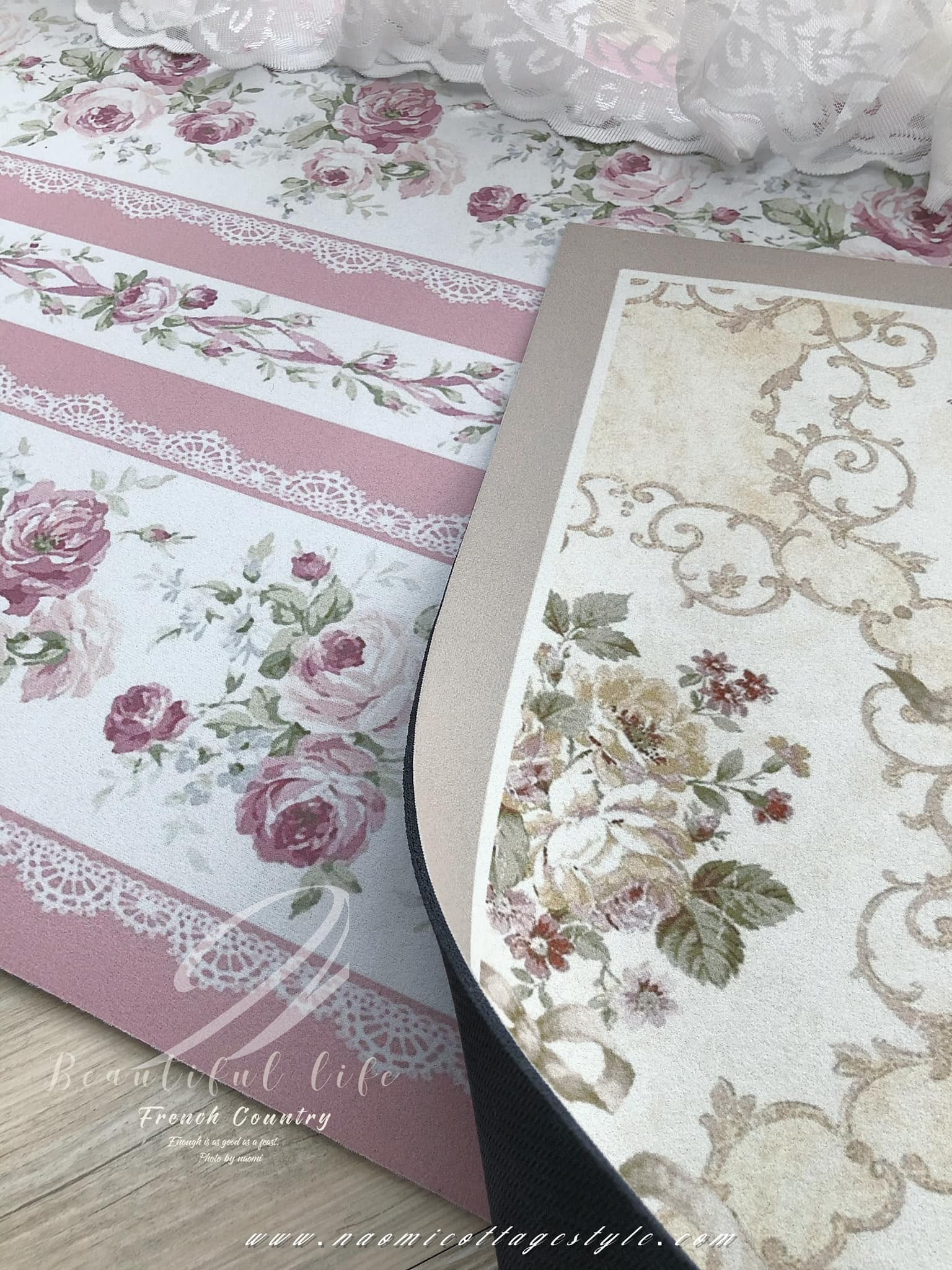 這次的新款花色很漂亮共2款:粉蕾絲很夢幻浪漫,綠圖騰很復古,實體顏色像橄欖綠,很有復古氣息。踩起來的觸感也很好,是稍有厚度的,地墊背部止滑。這材質吸水,很適合放廚房手槽或浴室、浴缸前,髒了可做清洗的軟墊材質。