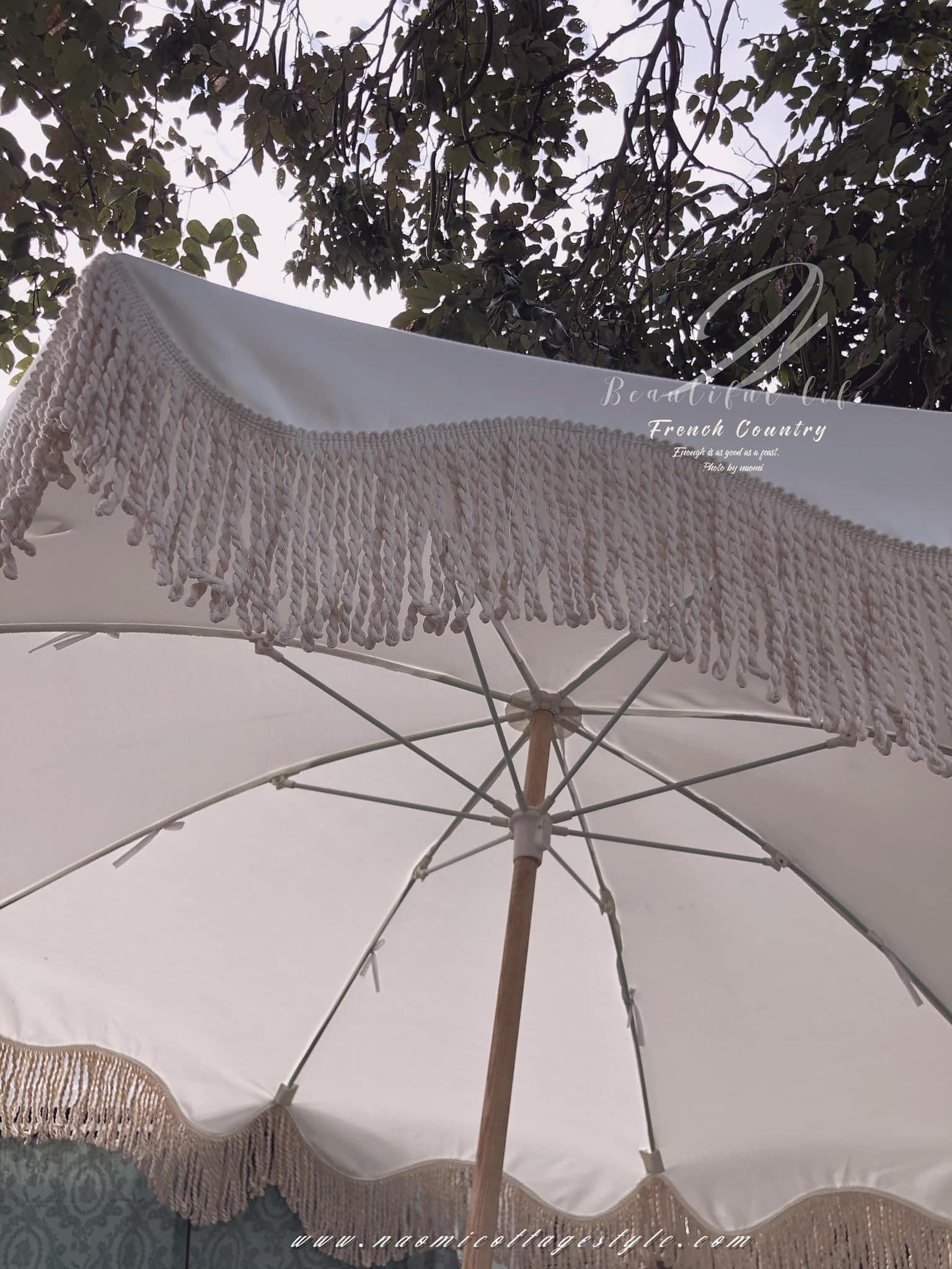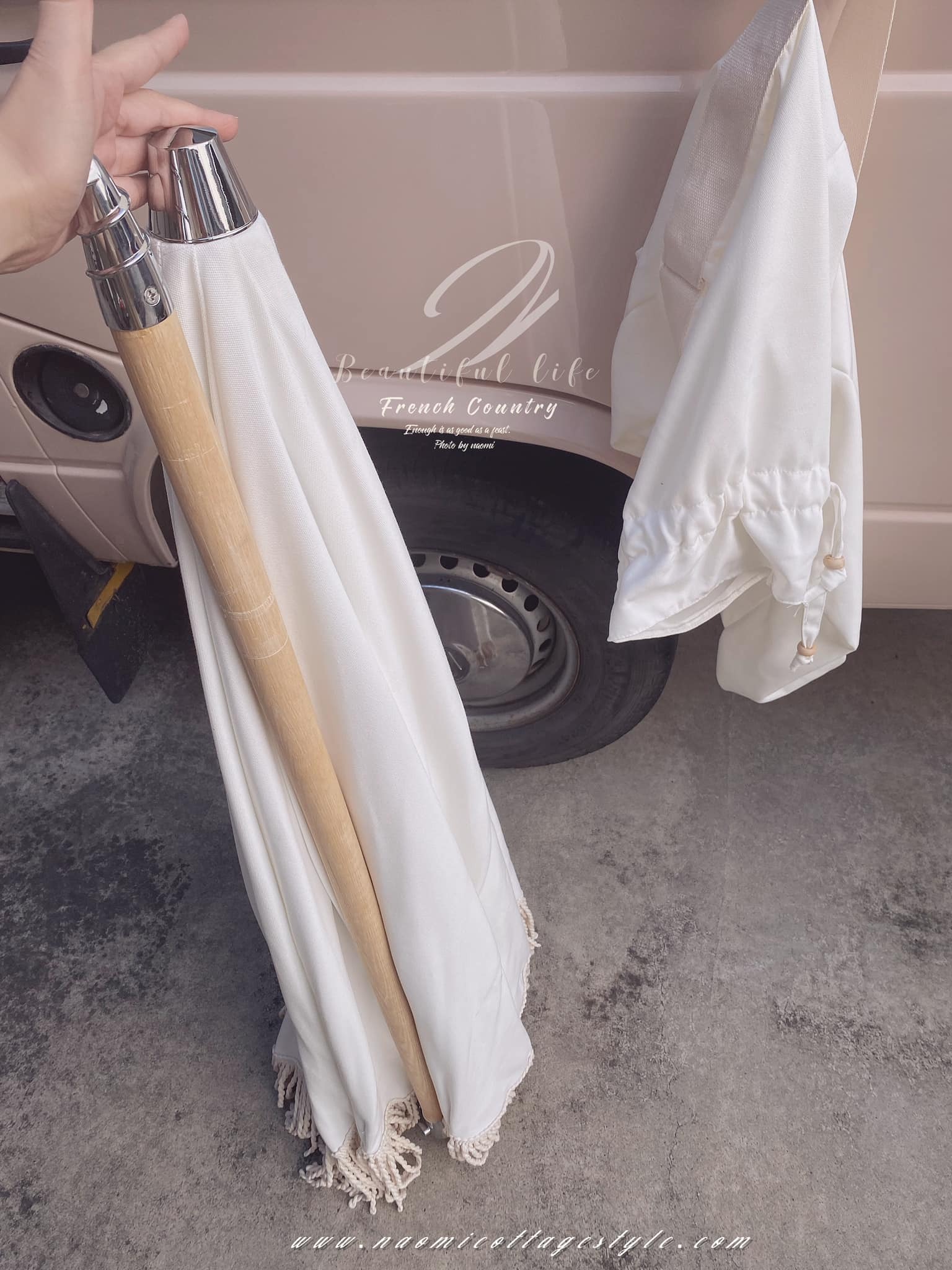 ✔️材質:傘面為滌淪帆布+本色流蘇,傘架纖維骨架,32MM實木中棒鋅合金轉軸+鋅合金螺旋尖角+鋅合金傘頂