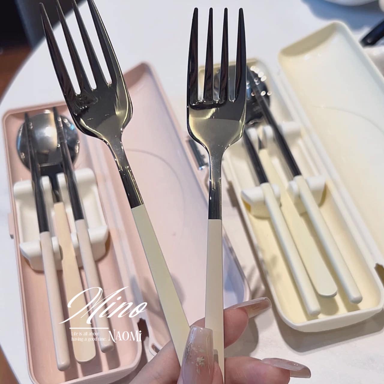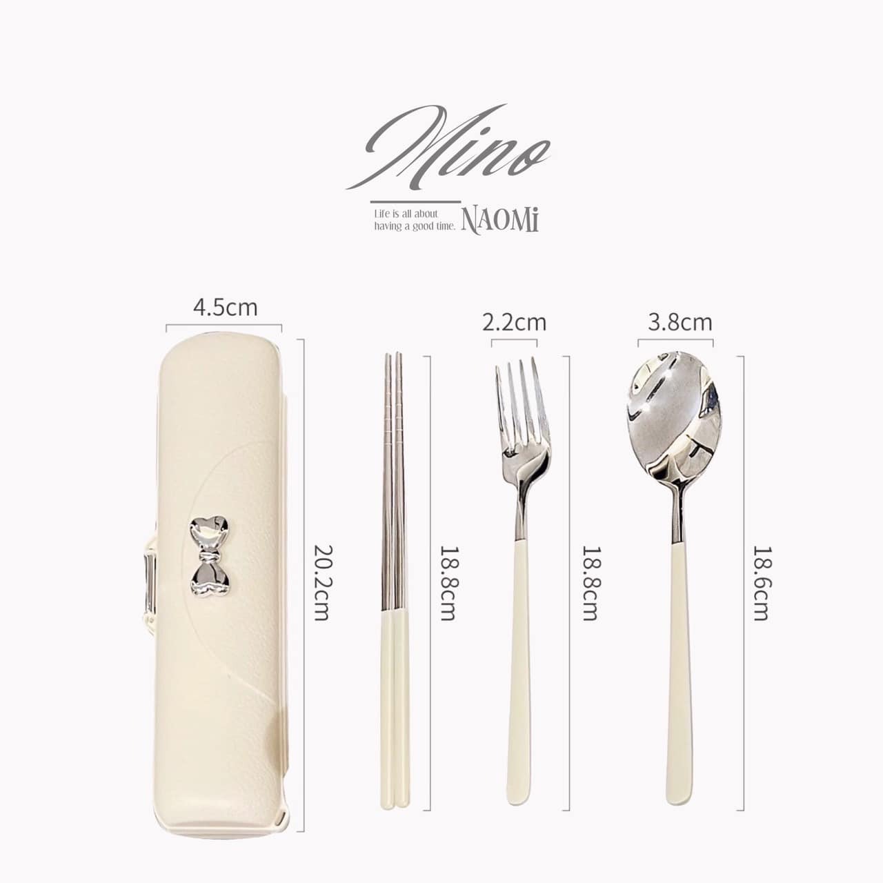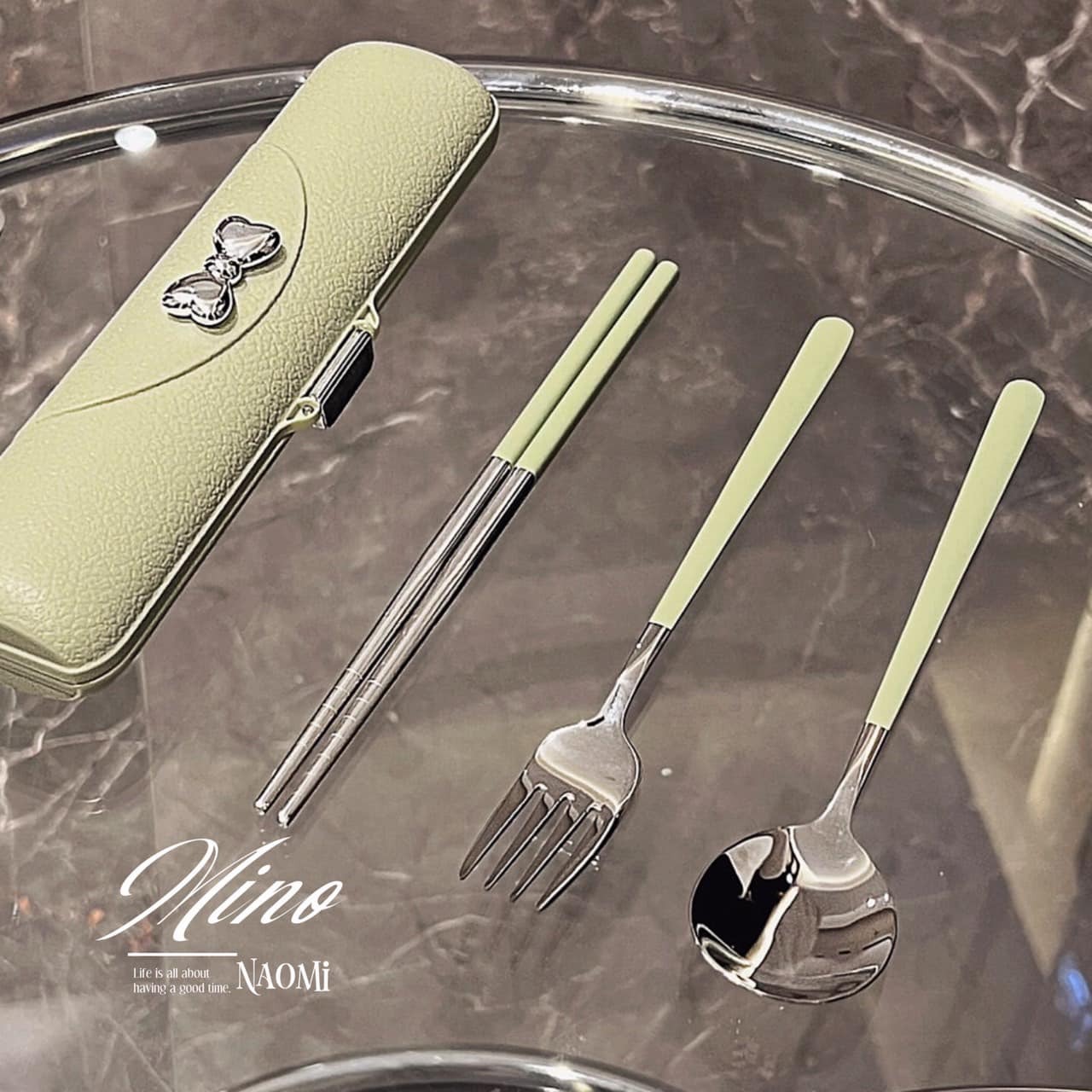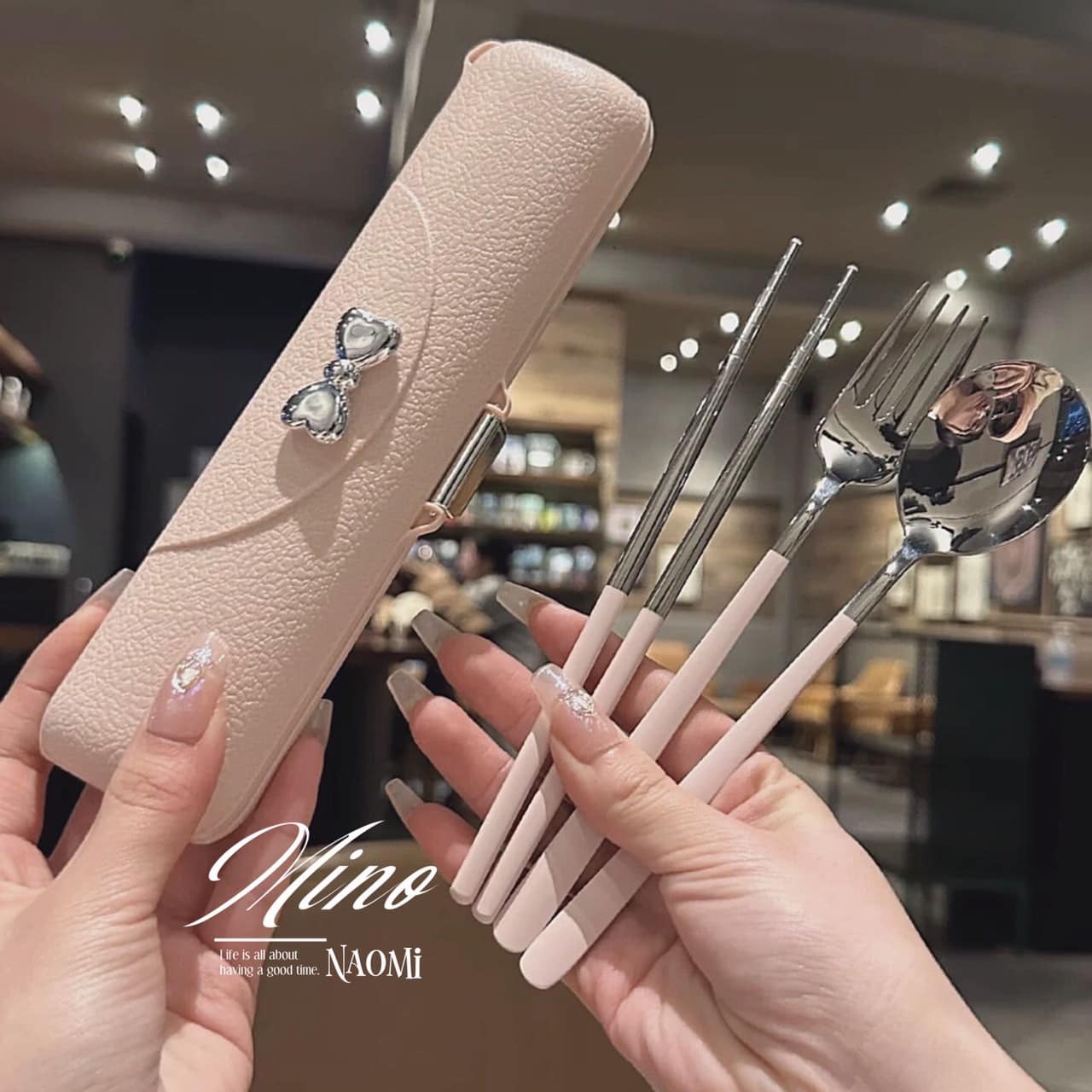 #外出必備🎀蝴蝶結皮革質感不鏽鋼餐具組🍴|筷子勺子叉子餐具組、隨身參具、便攜式餐具 》290元/組
