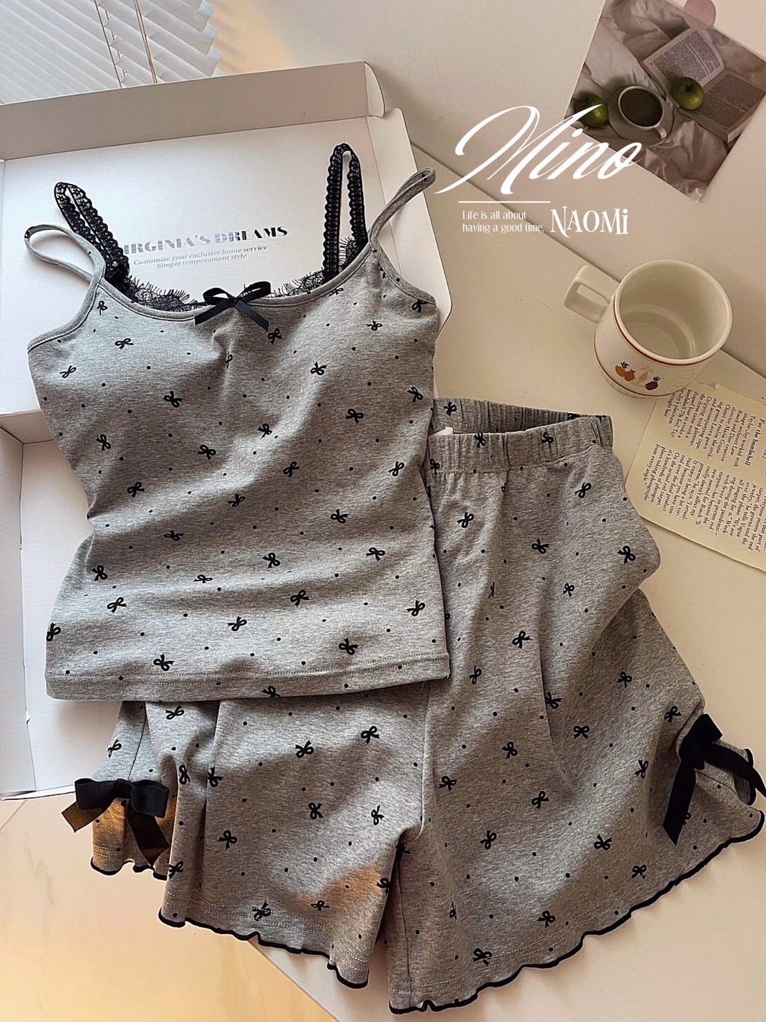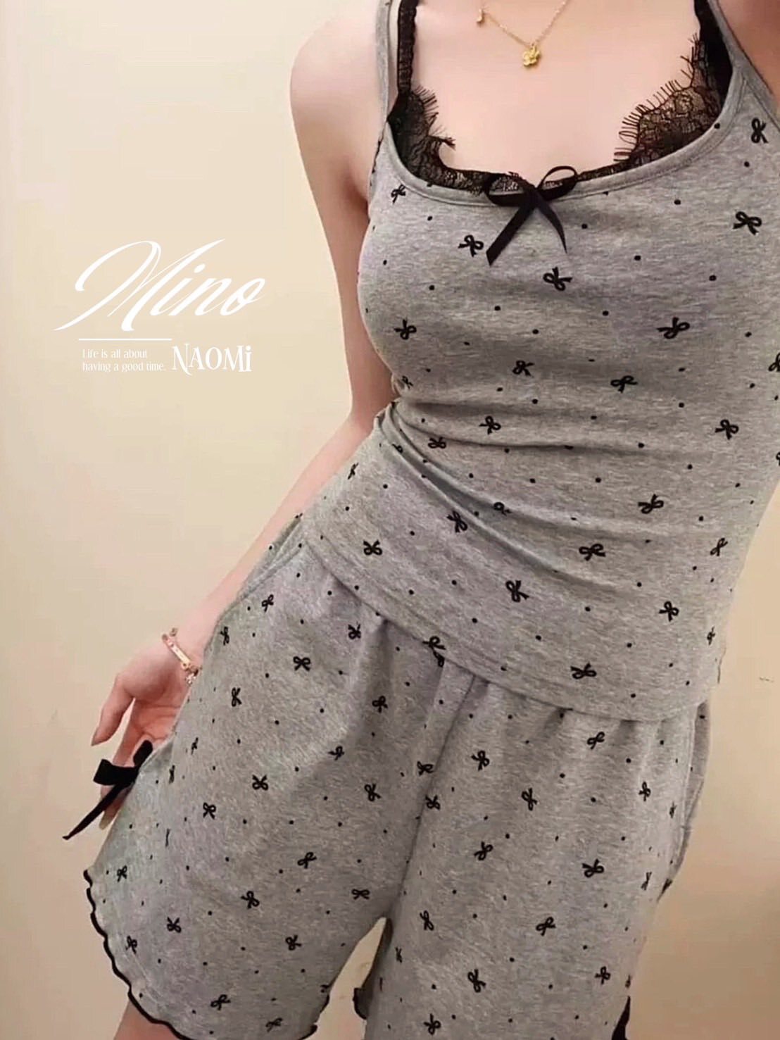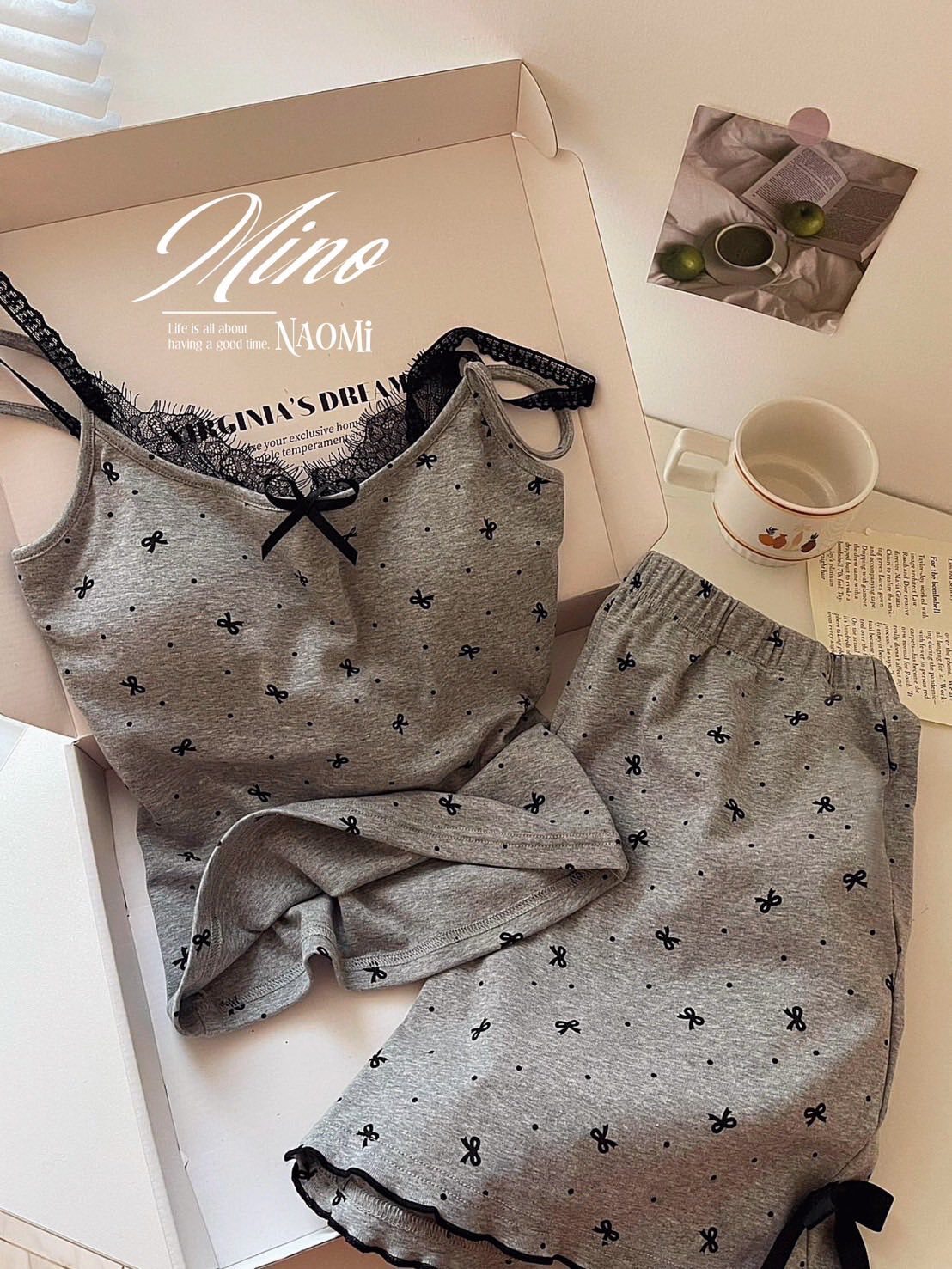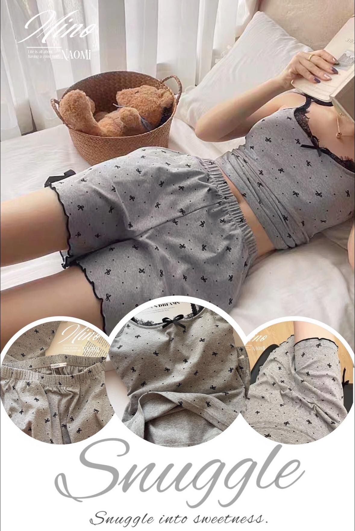 夏日準備起來💓貼心自帶胸墊設計,質感灰色底搭配俏皮蝴蝶結圖騰,小性感黑蕾絲點綴領口,腰間小蝴蝶結、褲腳荷葉邊,讓慵懶居家時光也能可愛又有型!