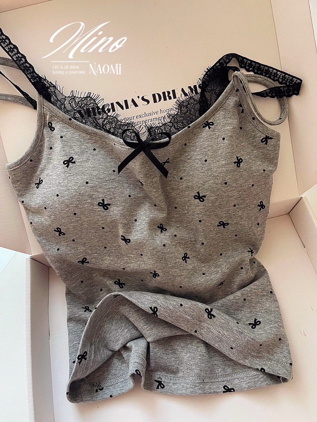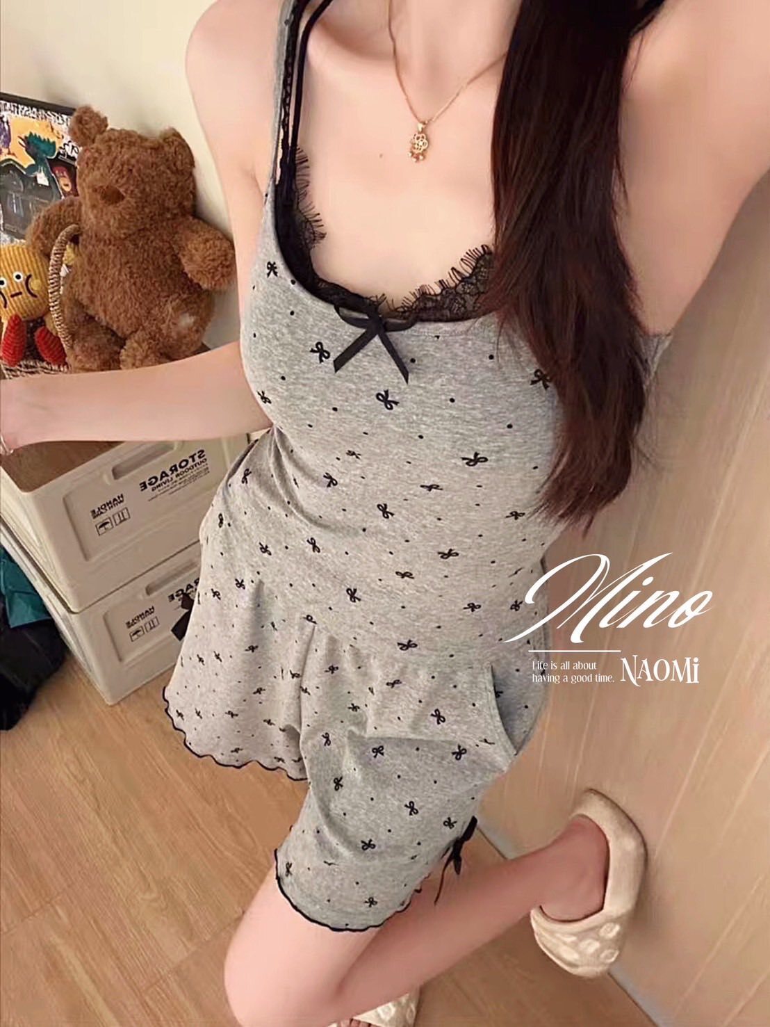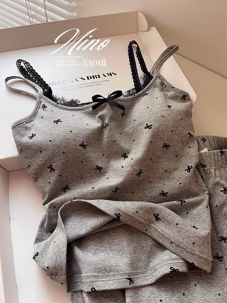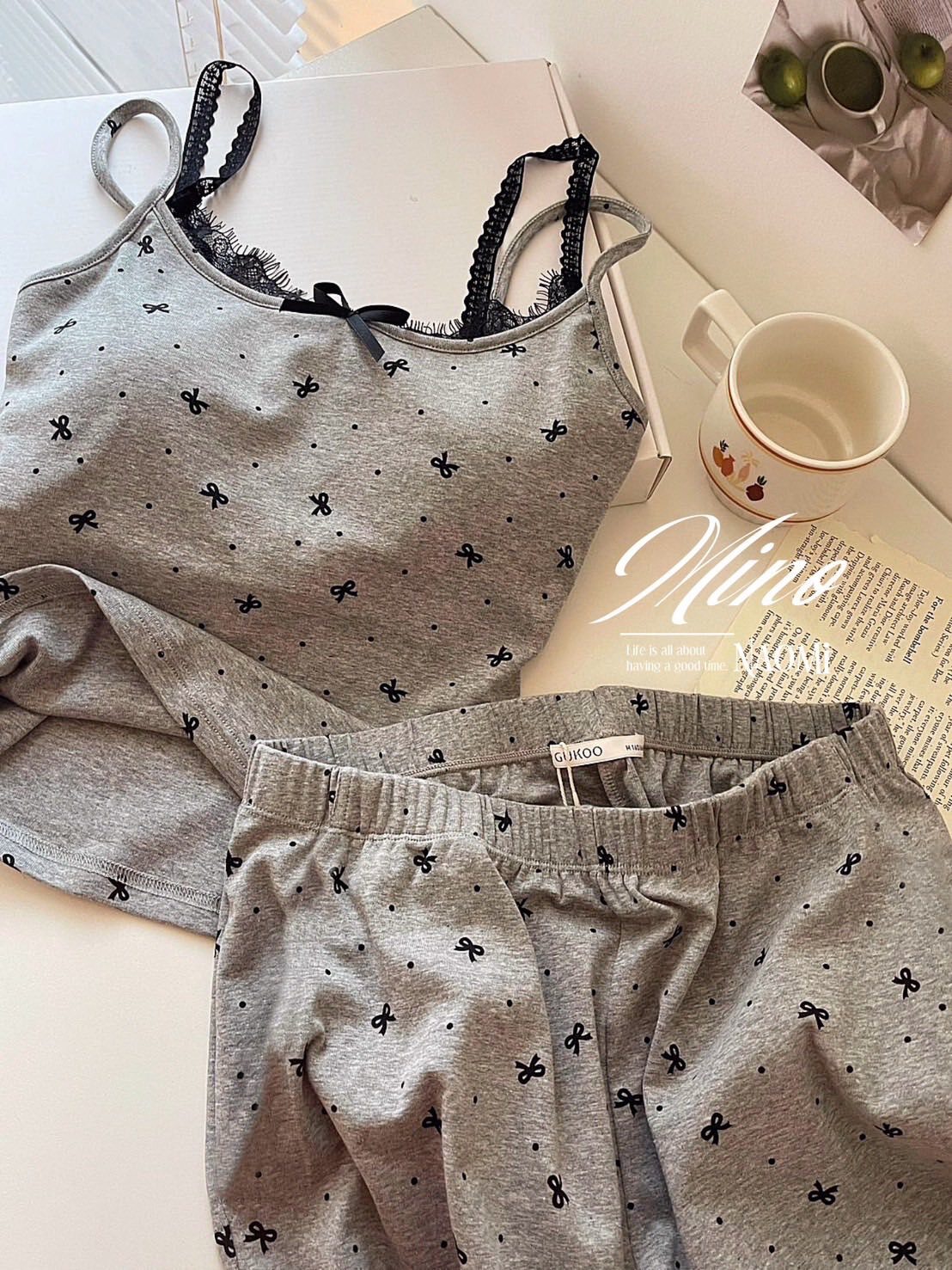 夏日準備起來💓貼心自帶胸墊設計,質感灰色底搭配俏皮蝴蝶結圖騰,小性感黑蕾絲點綴領口,腰間小蝴蝶結、褲腳荷葉邊,讓慵懶居家時光也能可愛又有型!