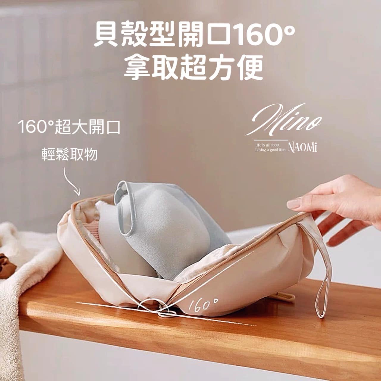 內部有獨立分隔區,可收納3-4件內衣、4-6條內褲及數雙襪子,160°貝殼大開口,取物超輕鬆!