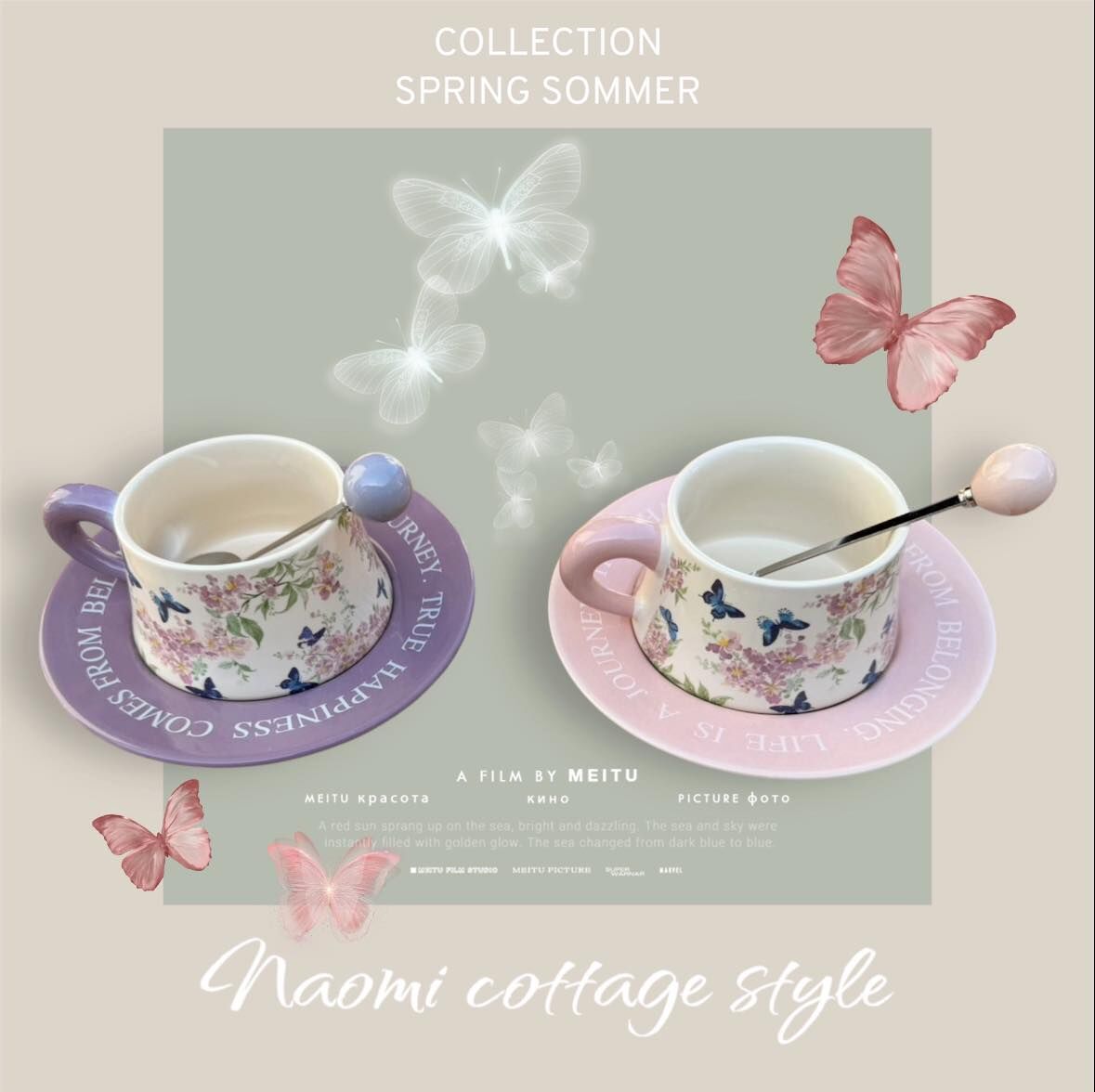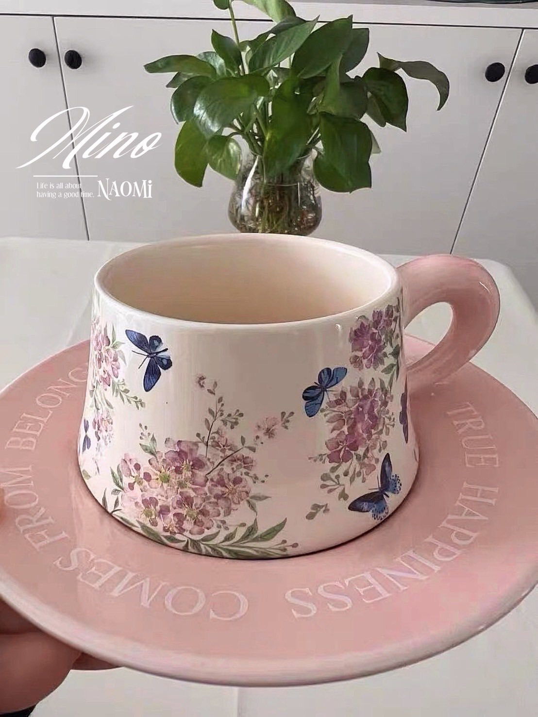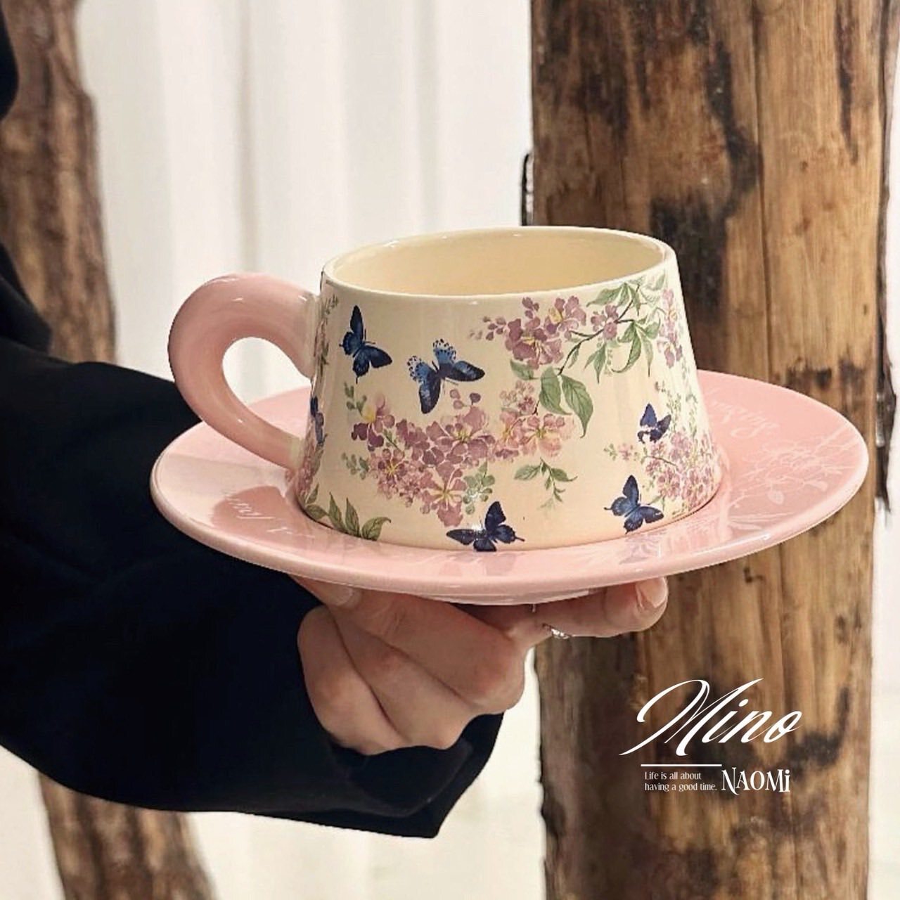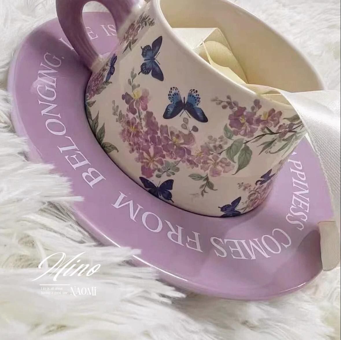 《紫薇花蝶影陶瓷杯碟套裝|文藝復古下午茶咖啡杯組》
