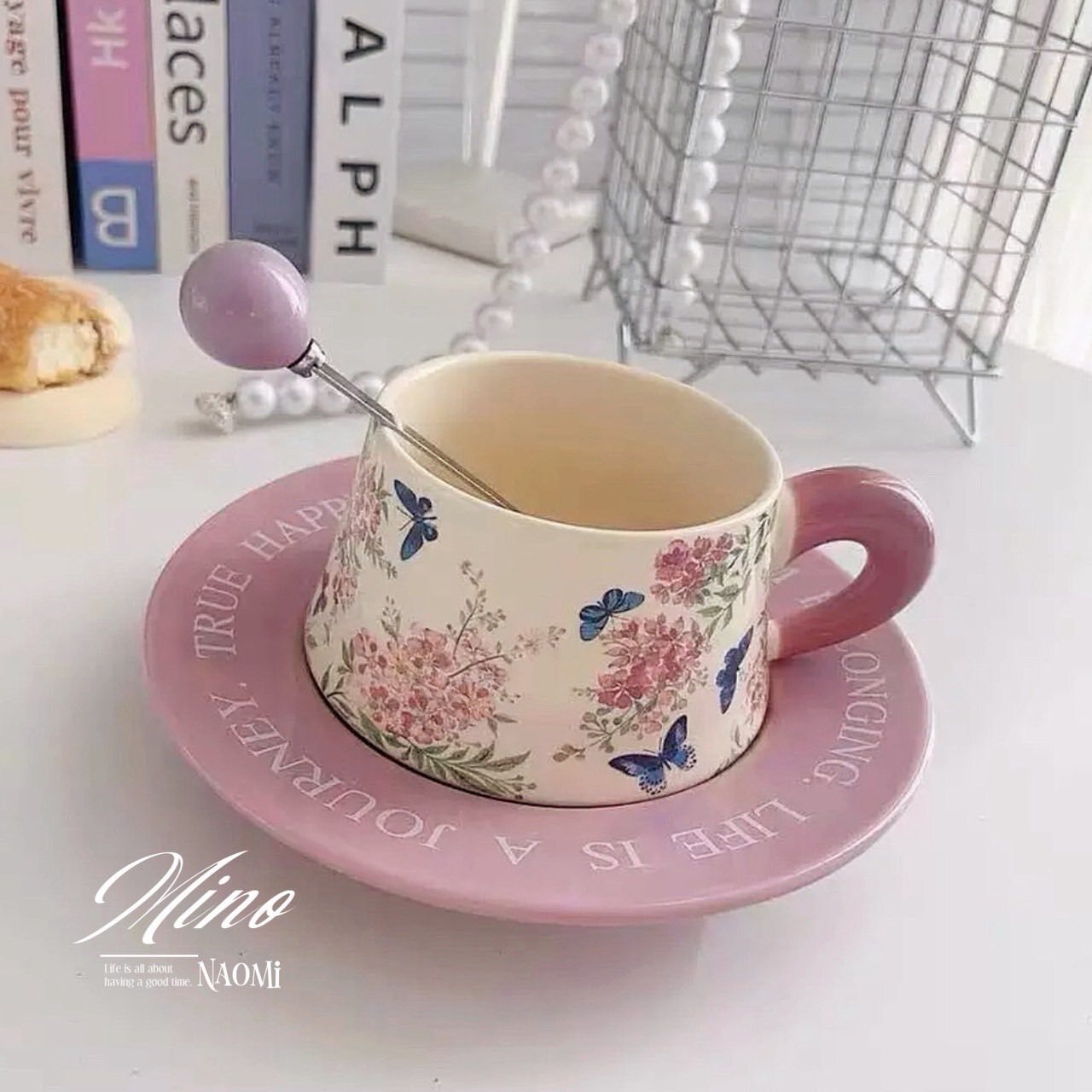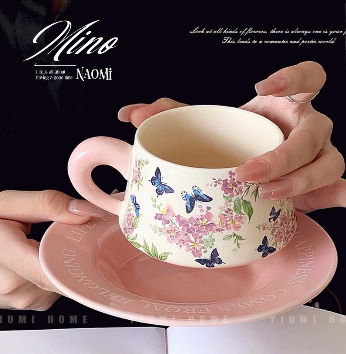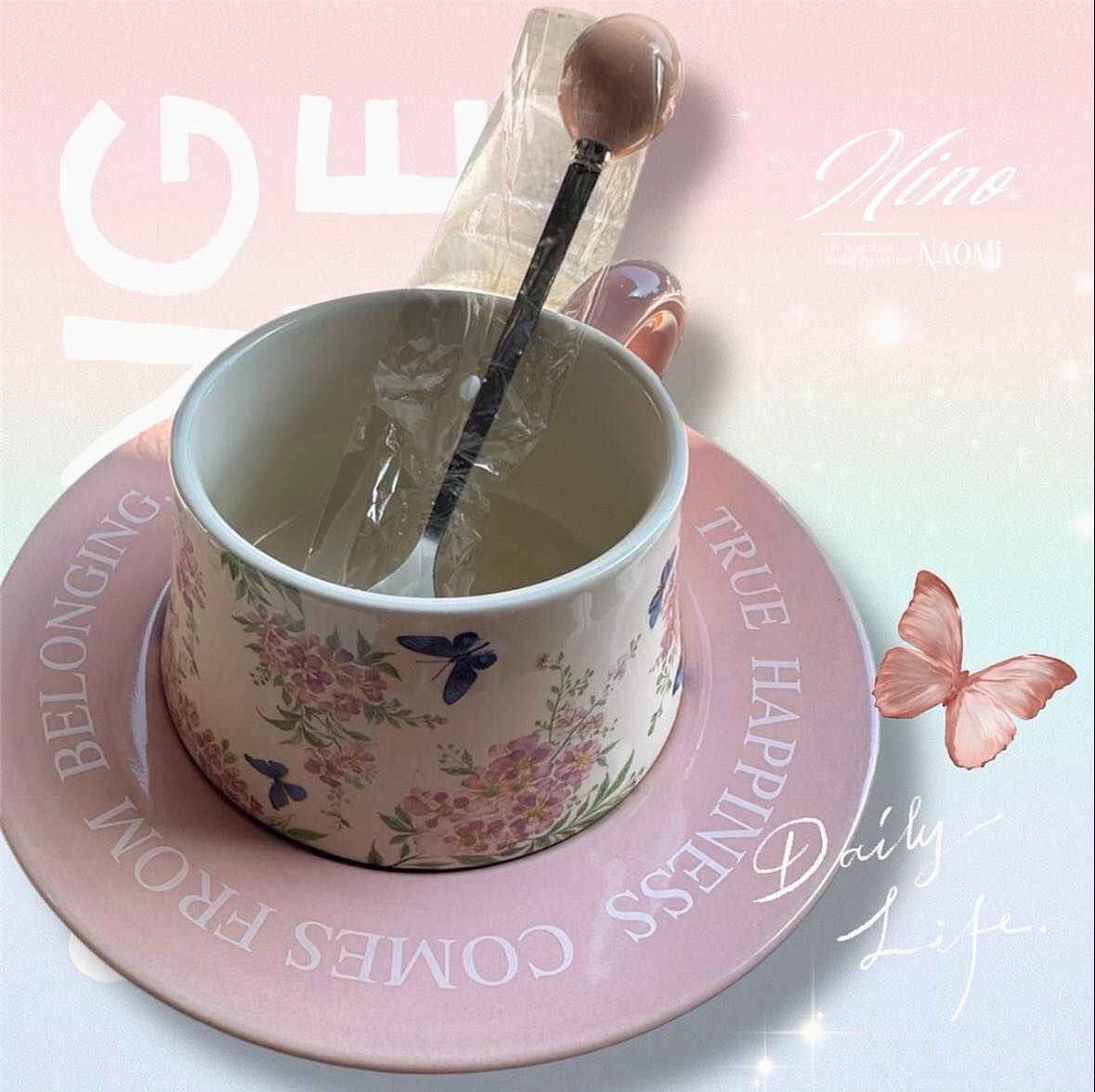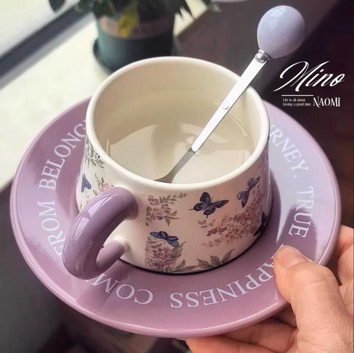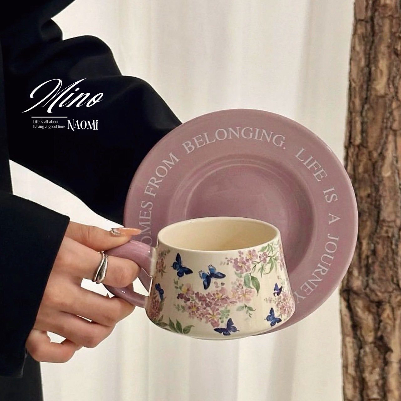 《紫薇花蝶影陶瓷杯碟套裝|文藝復古下午茶咖啡杯組》