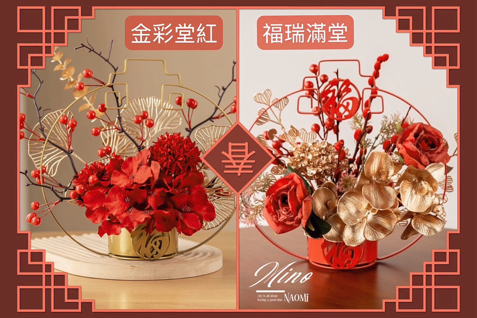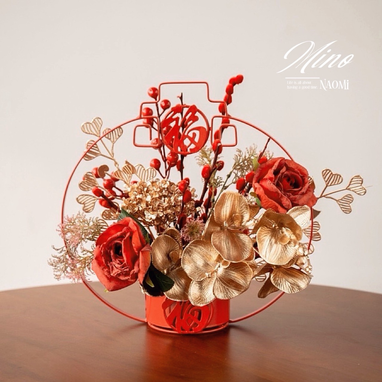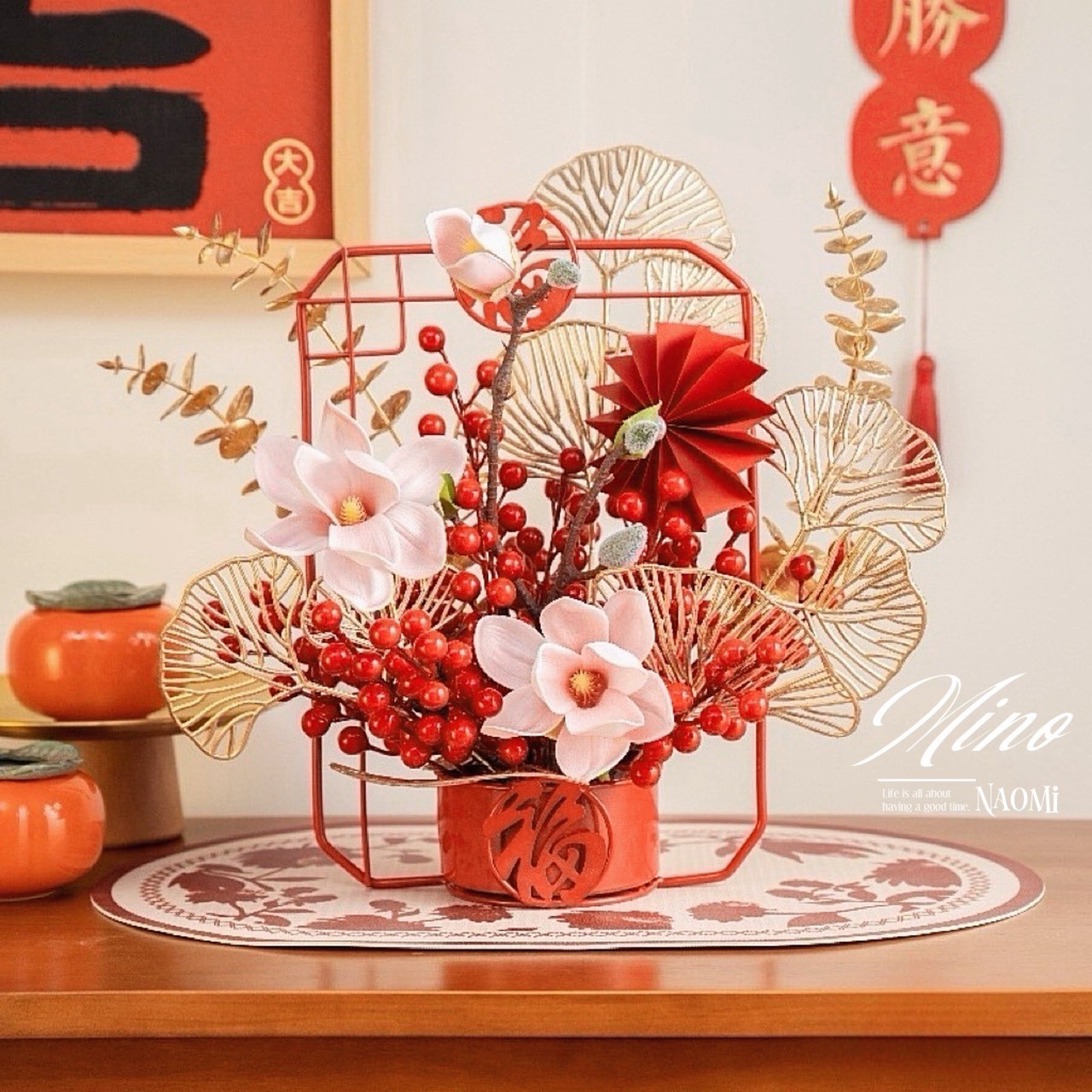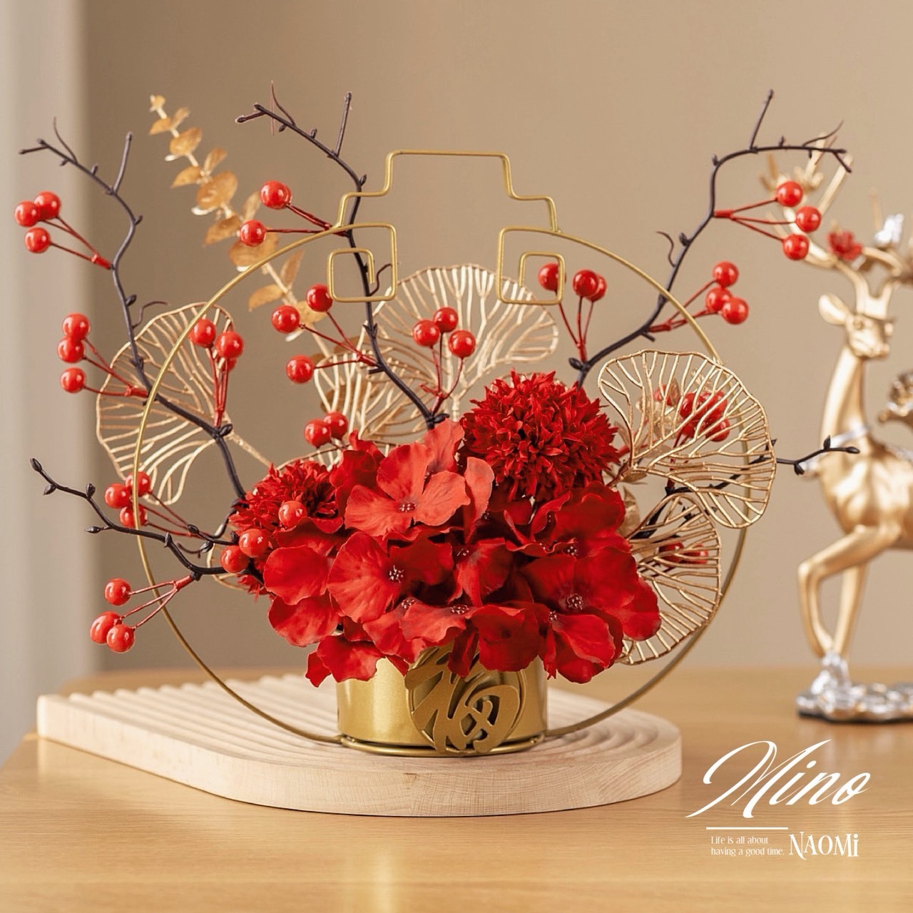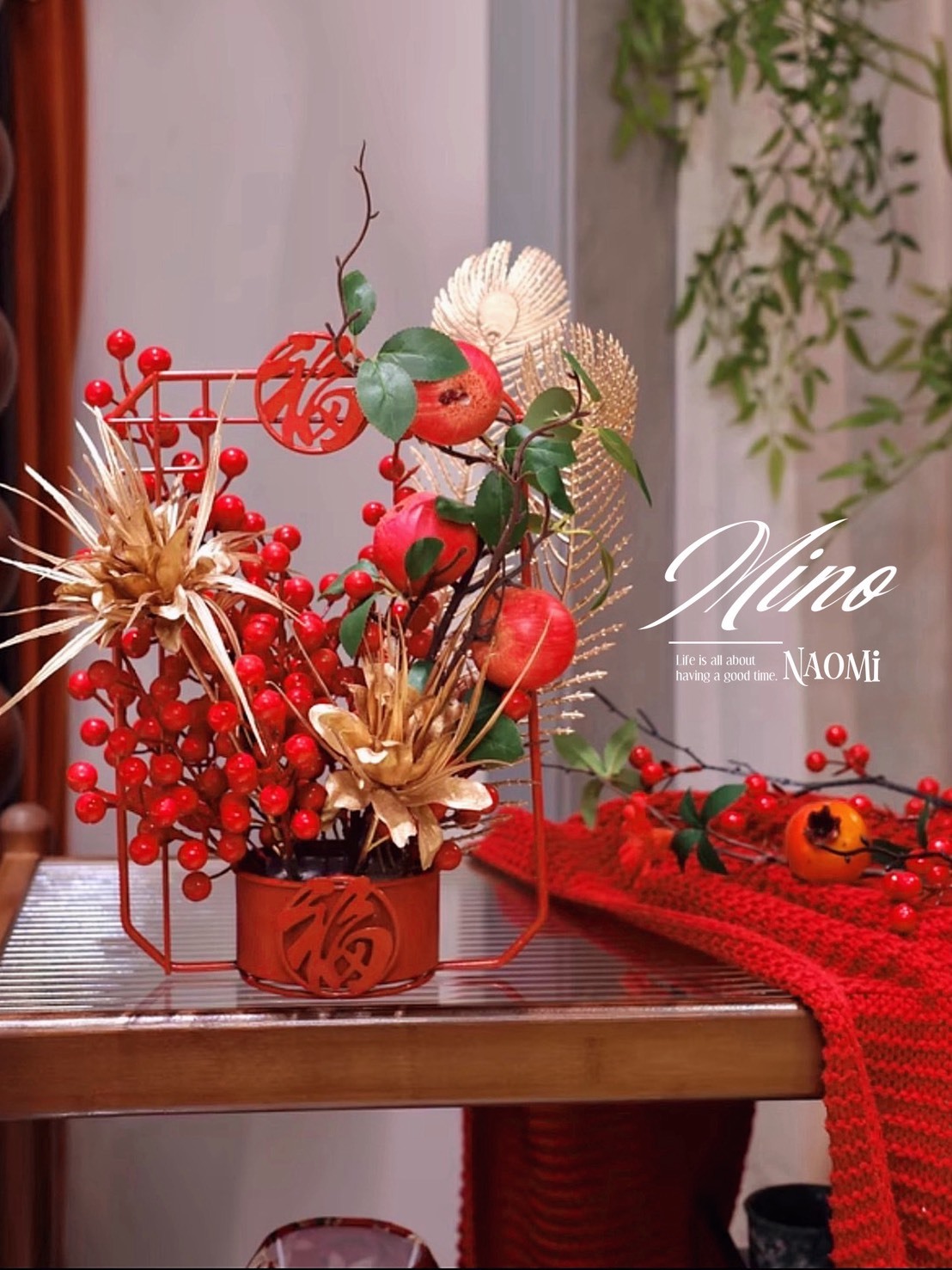 以新中式鐵藝花器為主體,搭配仿真花卉、果實、蘋果與福字設計,紅金配色溫潤不俗氣,一擺上桌,就是「過年了」的最好證明 ✨