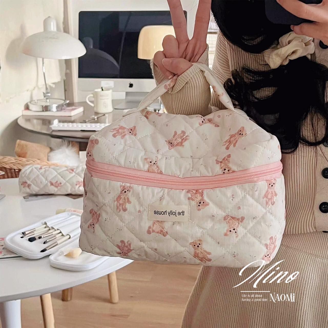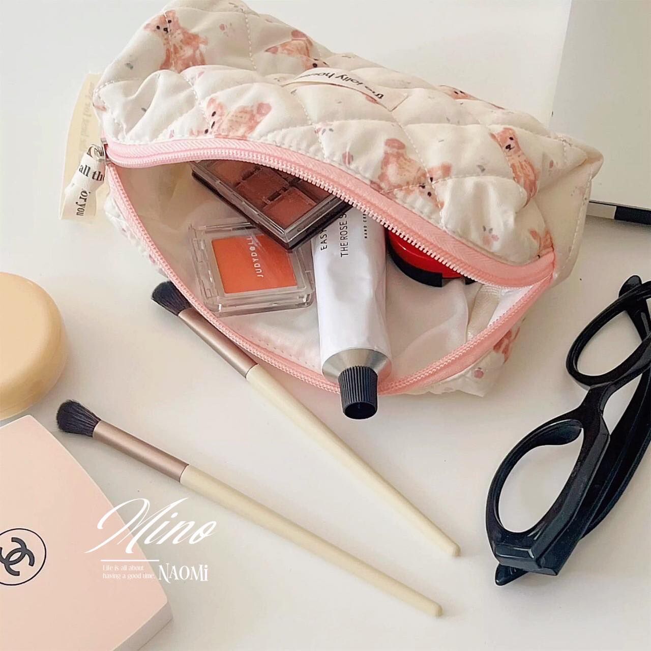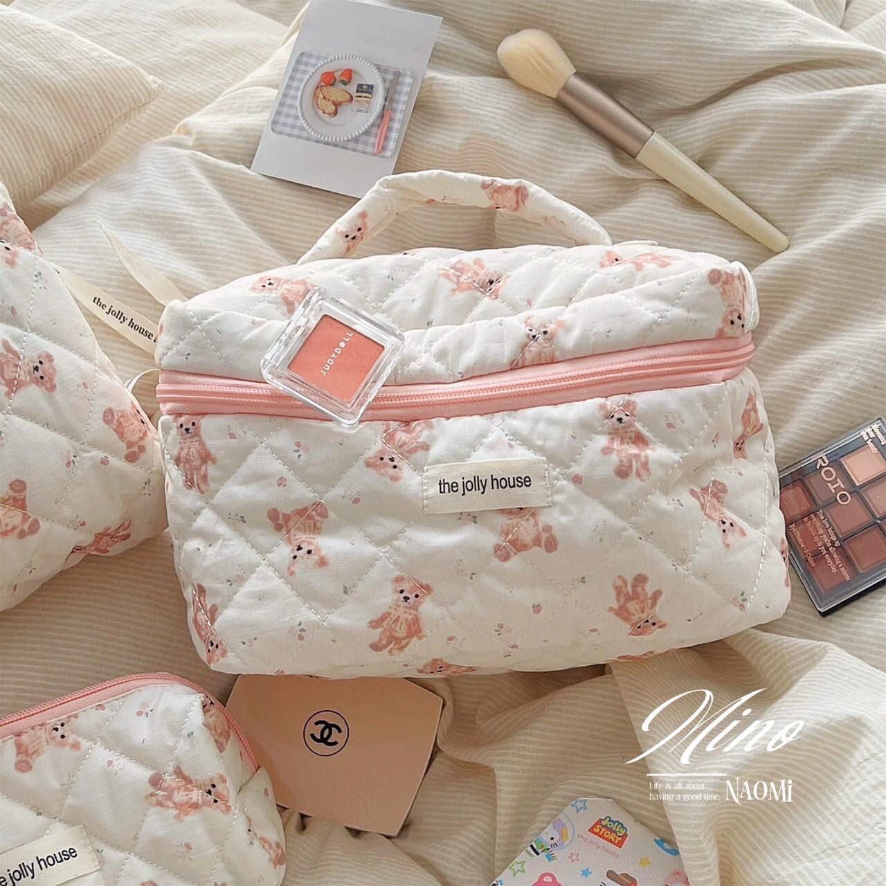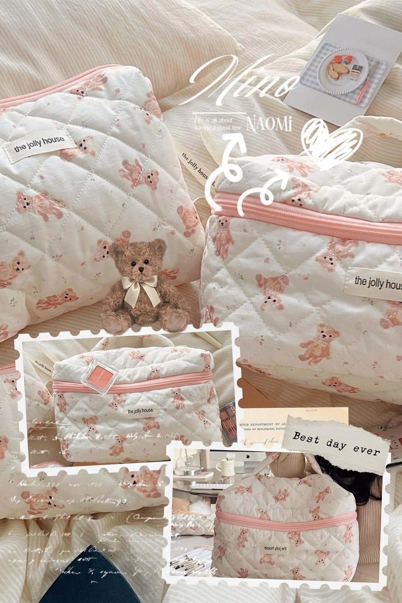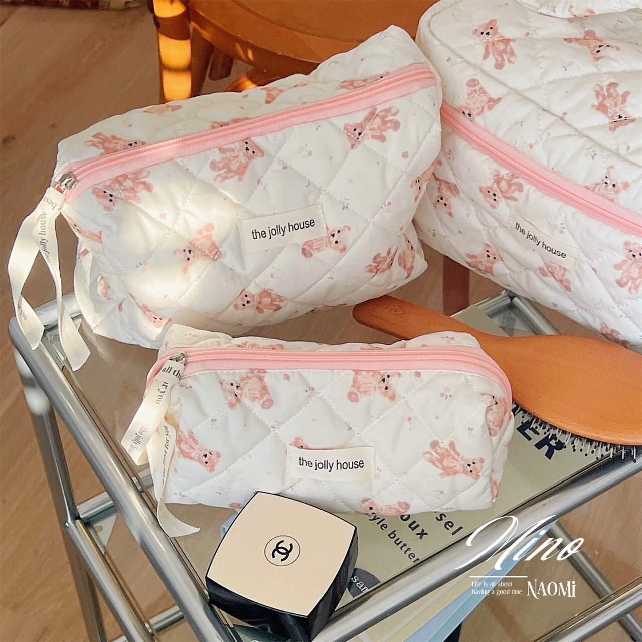 這款 粉色小熊化妝包 超萌來襲!可愛復古小熊設計搭配質感絎縫棉,手感柔軟,質感滿分。