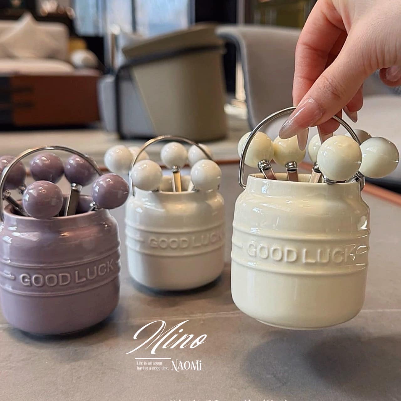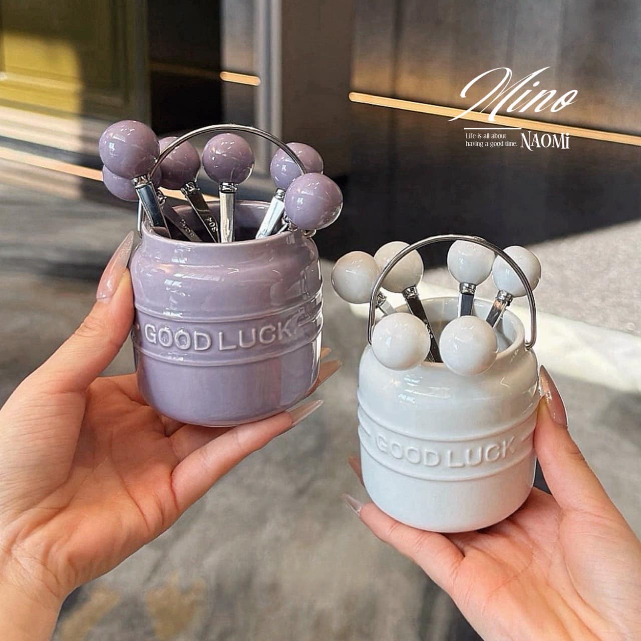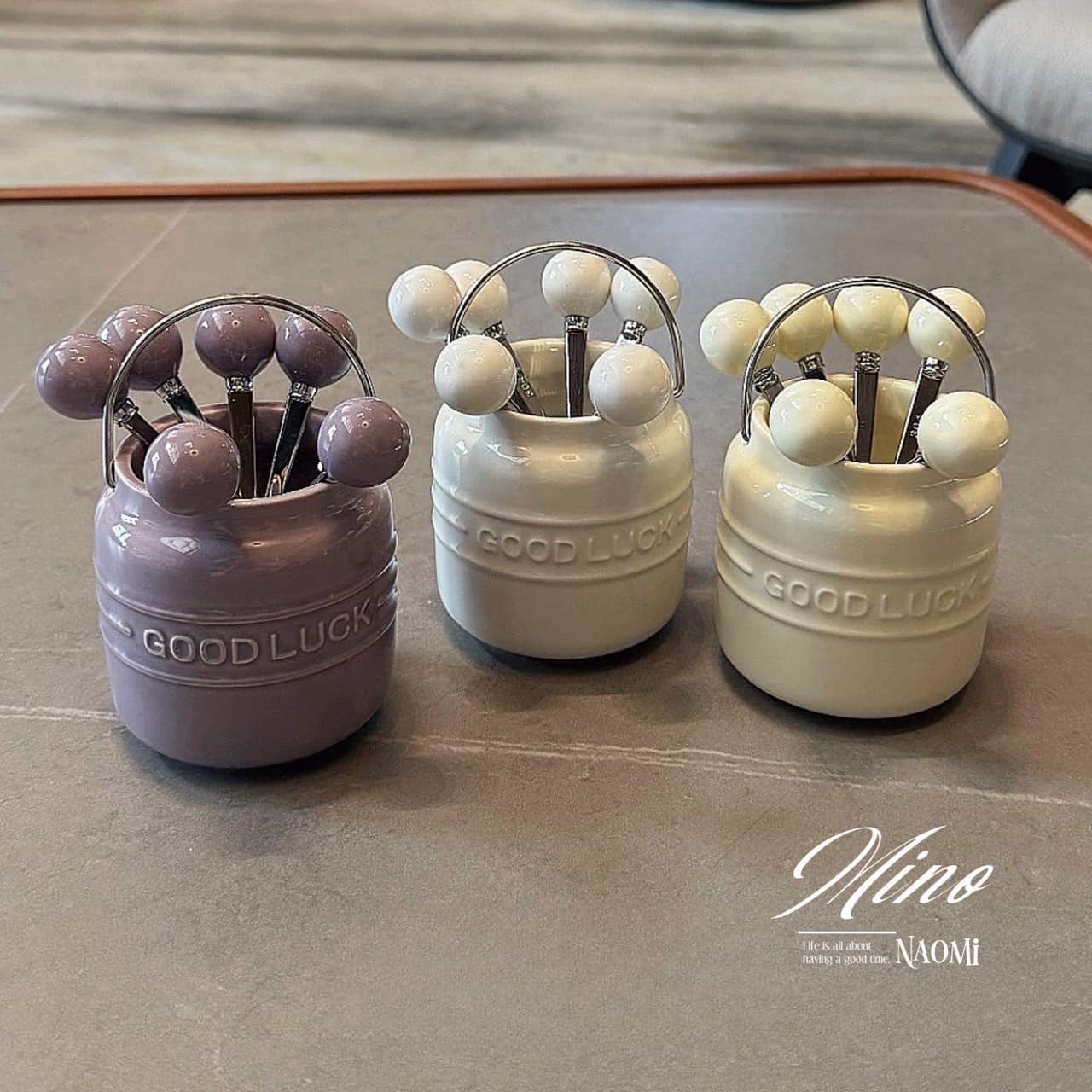 「GOOD LUCK」 字樣設計,寓意好運滿滿,搭配 圓球手柄 的水果叉,手感舒適,放在家裡、辦公桌、餐桌上都超有氛圍感✨