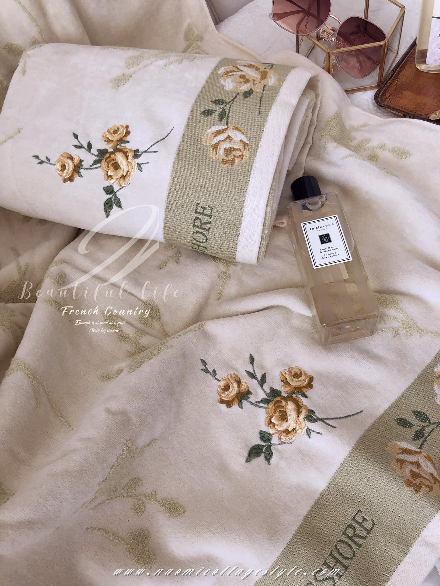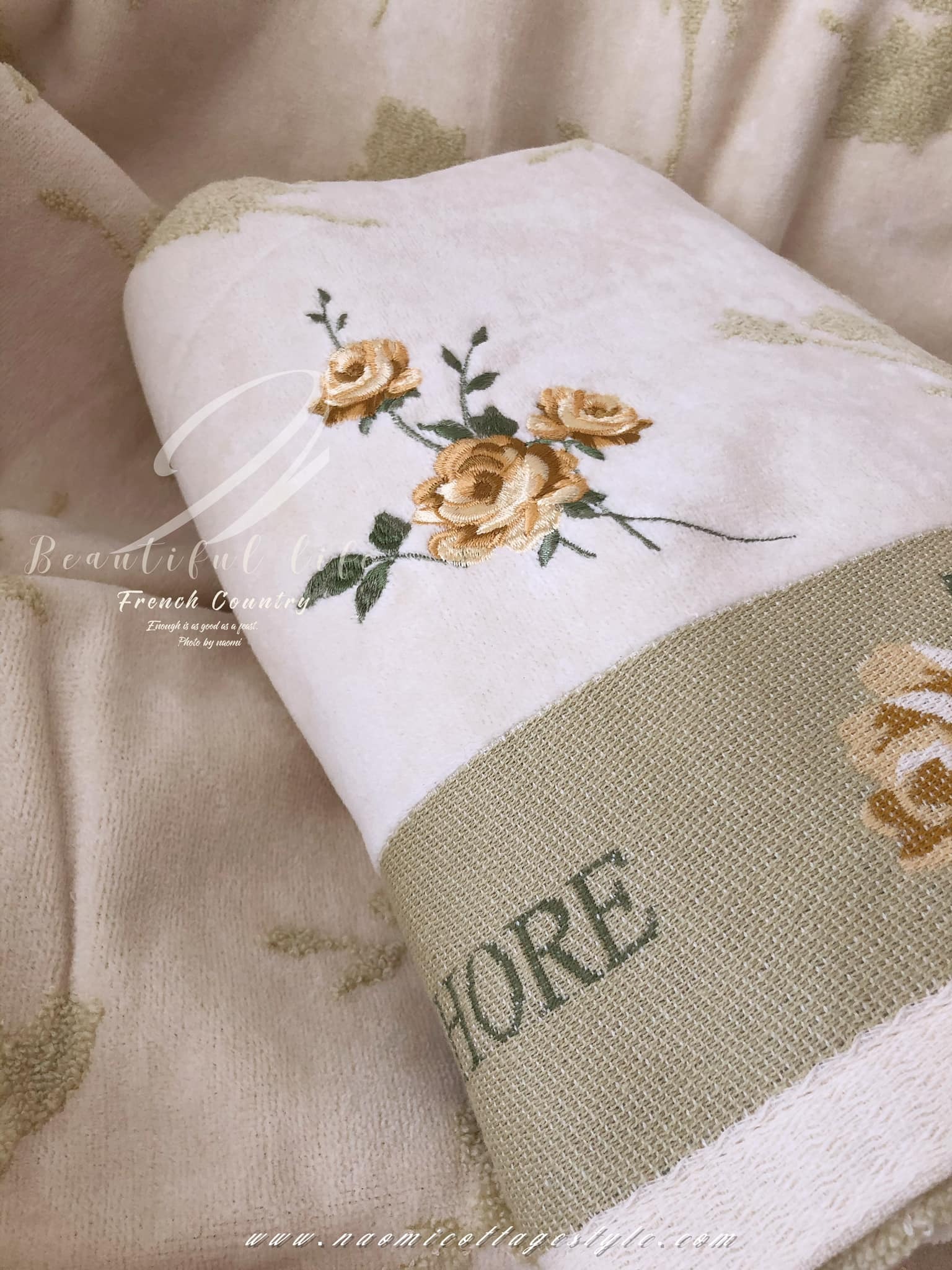 黃玫瑰繡花設計很復古優雅,而浴巾最重要的是不能掉棉絮,使用過才能推薦給大家,瞬間的吸水輕觸肌膚就能獲得很好的體驗。材質柔軟、吸水、棉柔親膚手感厚實。整體質感看的見,面料特別厚實有韌性,紗紡中已除去較短的纖維,加工製造為較平滑的紗線,使用起來沒有擾人的棉絮。